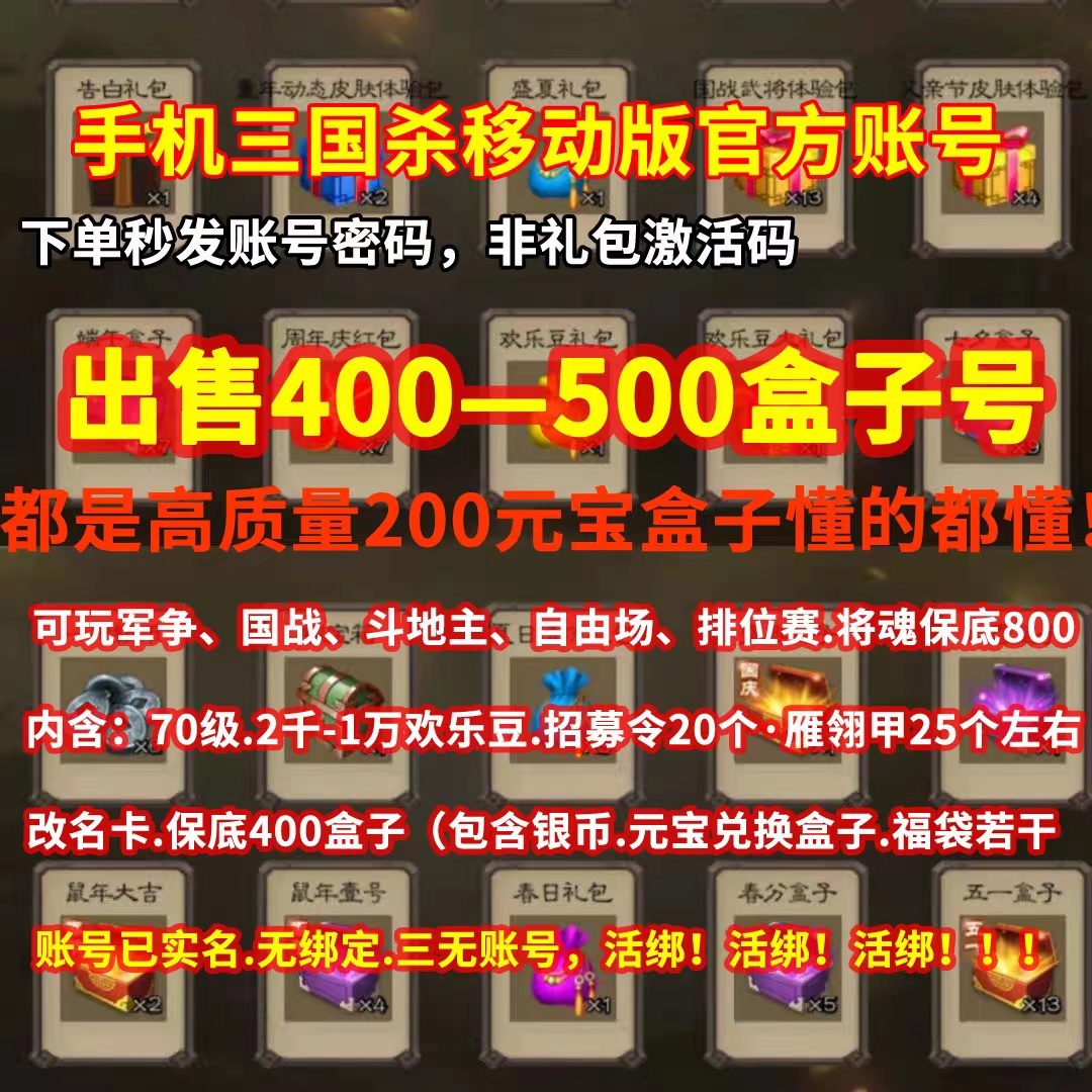 手机三国杀 移动版账号带若干盒子4级树元宝号开局号盒子号追梦