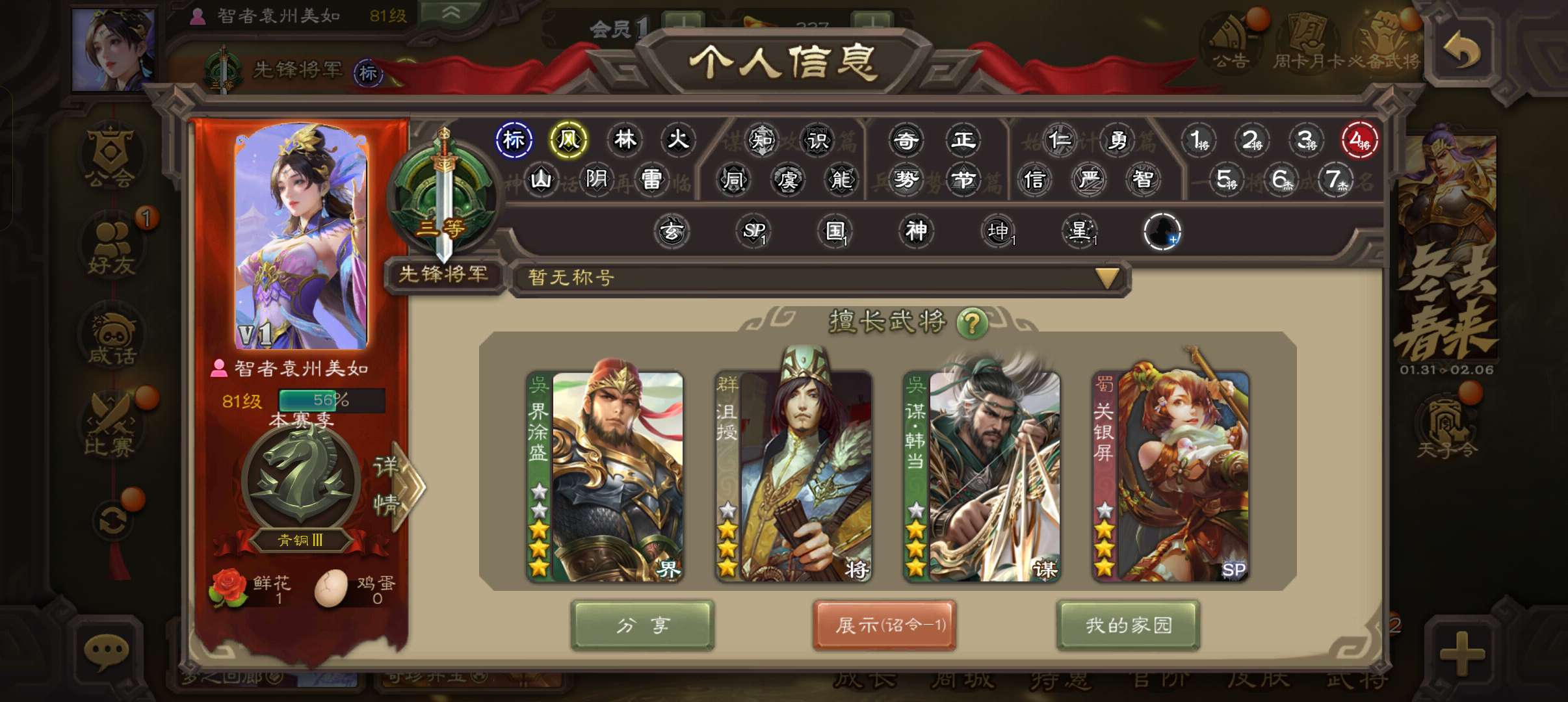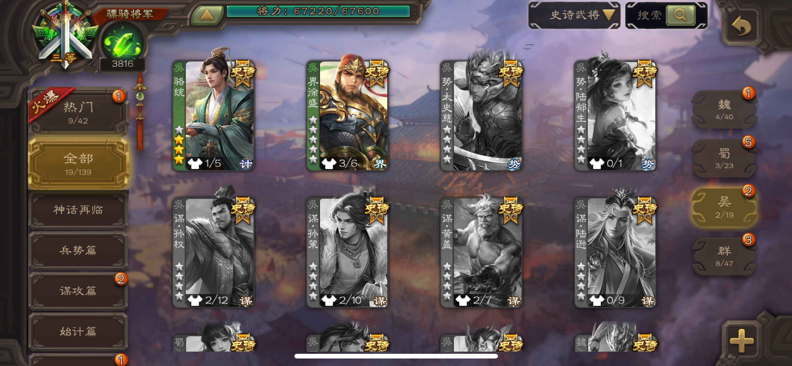 卡将百夫长,38宝珠9万羽毛1.1万将魂,谋韩当谋卢植谋小乔关银屏甘夫人69将,180招募令