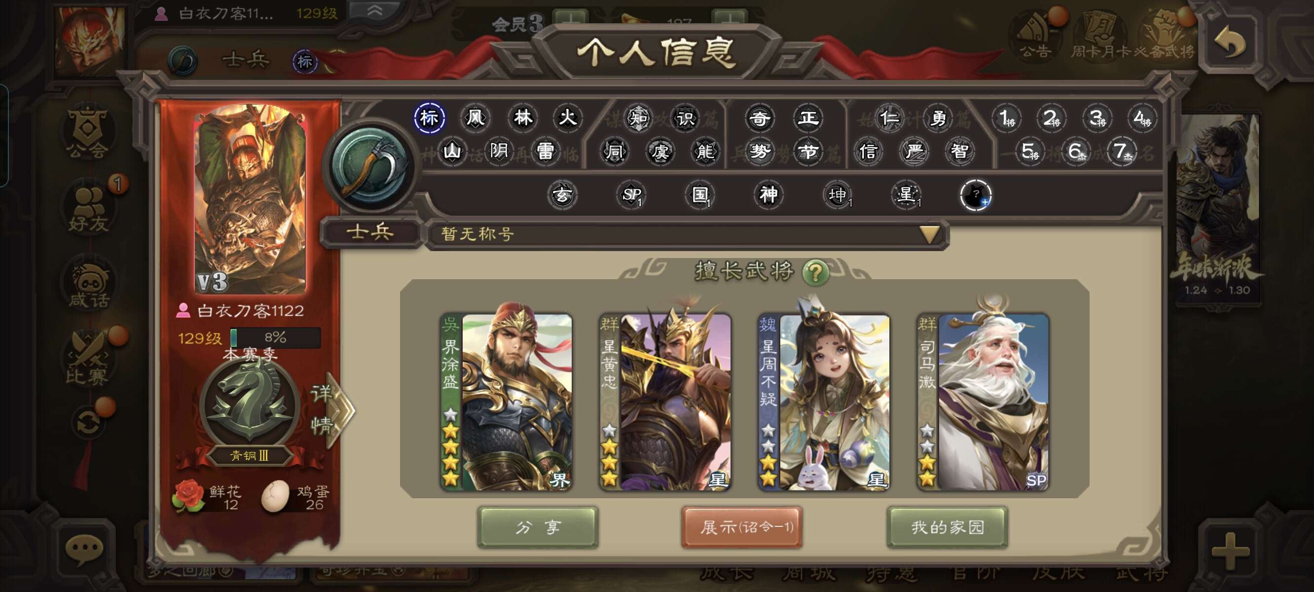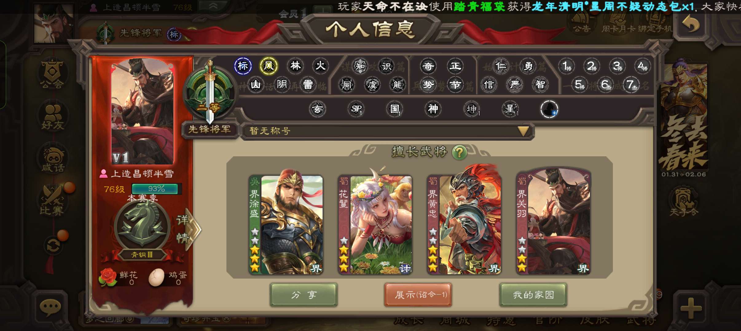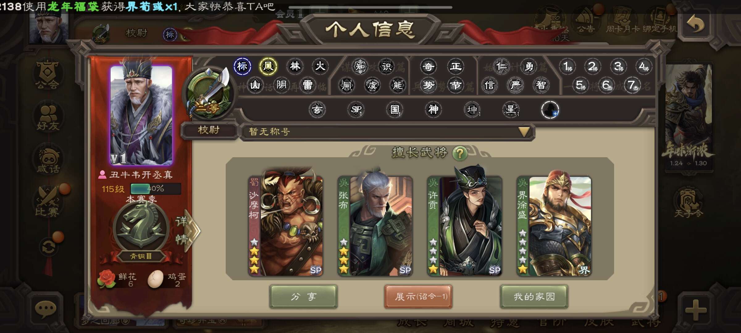 8.5万羽毛1.2万将魂7万豆,大宝界徐盛沮授双史诗先锋,谋韩当谋卢植谋小乔界满宠关银屏149将