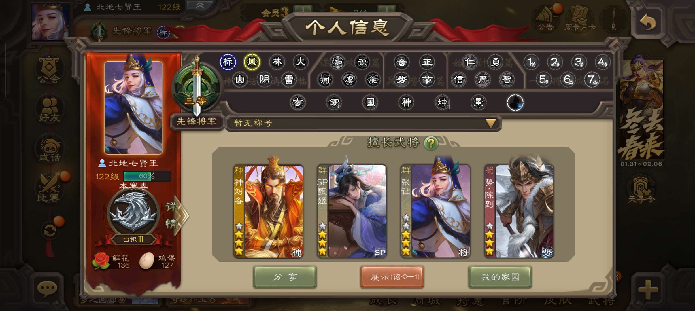 6史诗先锋,4.5万羽毛,sp甄姬神刘备金皮张让吴景嵇康杨修,甘夫人关银屏谋高顺崔琰势陈到145将