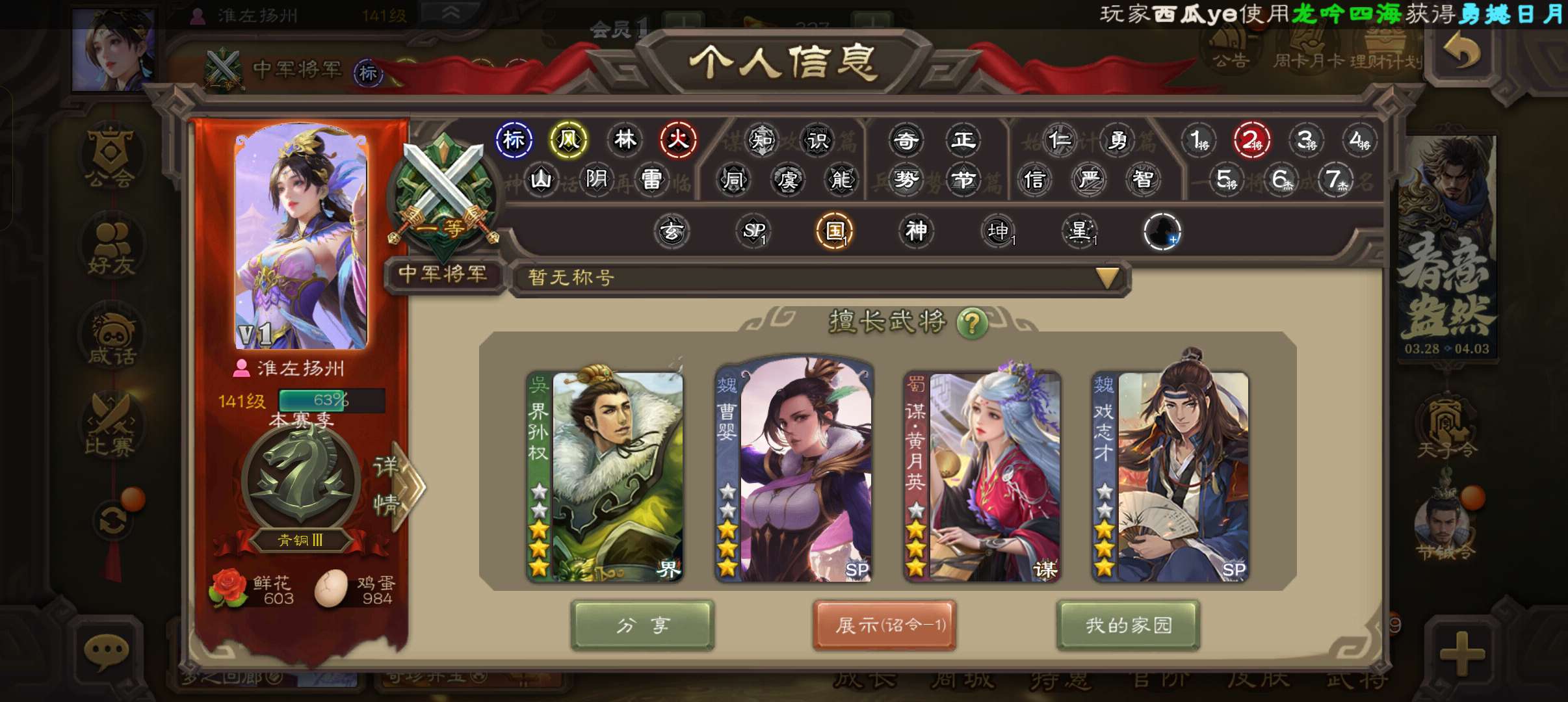 准领军,32宝珠12万羽毛7200魂,真动曹婴戏志才金皮花鬘谯周程昱,谋黄月英sp赵云194将