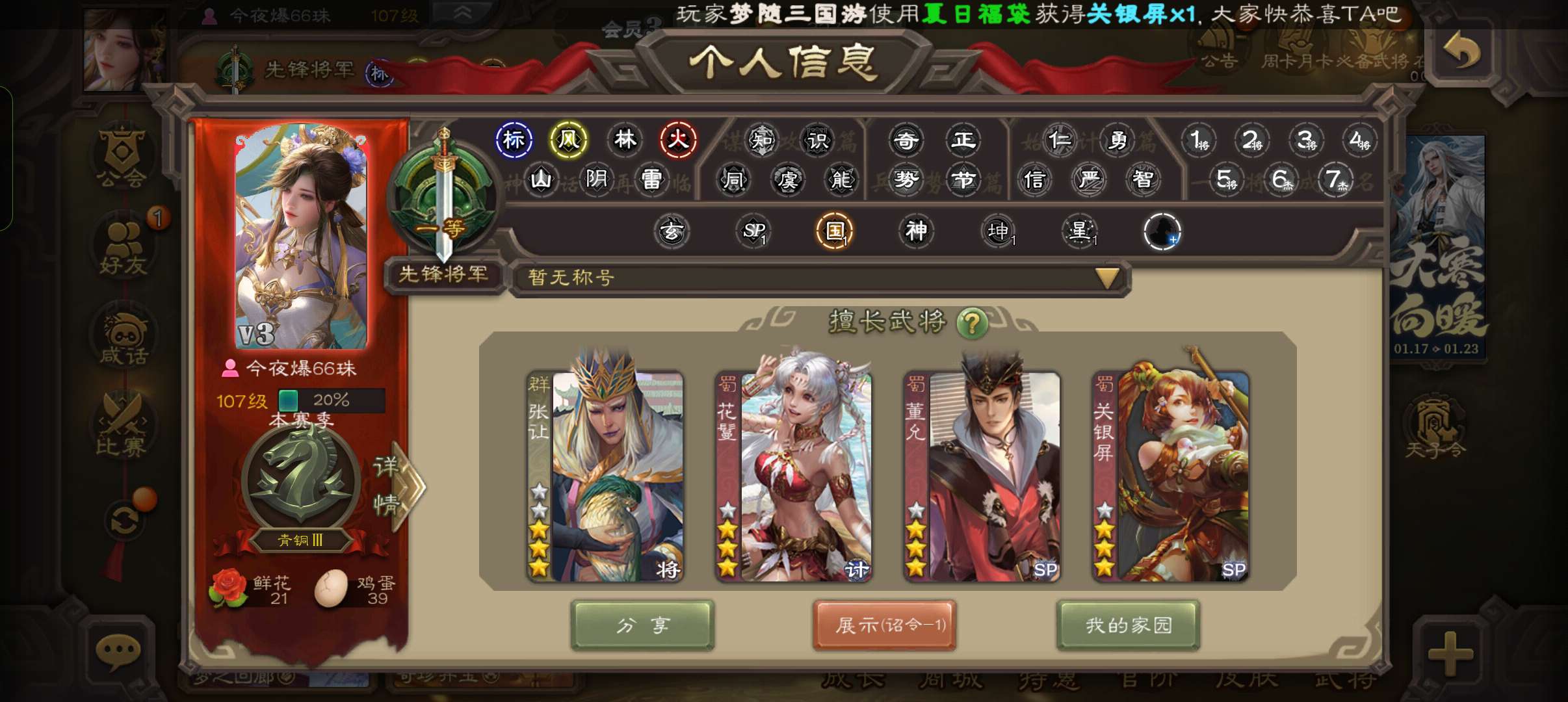 40宝珠9万羽毛1.2万将魂6.7万豆,张让花鬘董允3史诗先锋,关银屏谋高顺谋韩当154将一等先锋