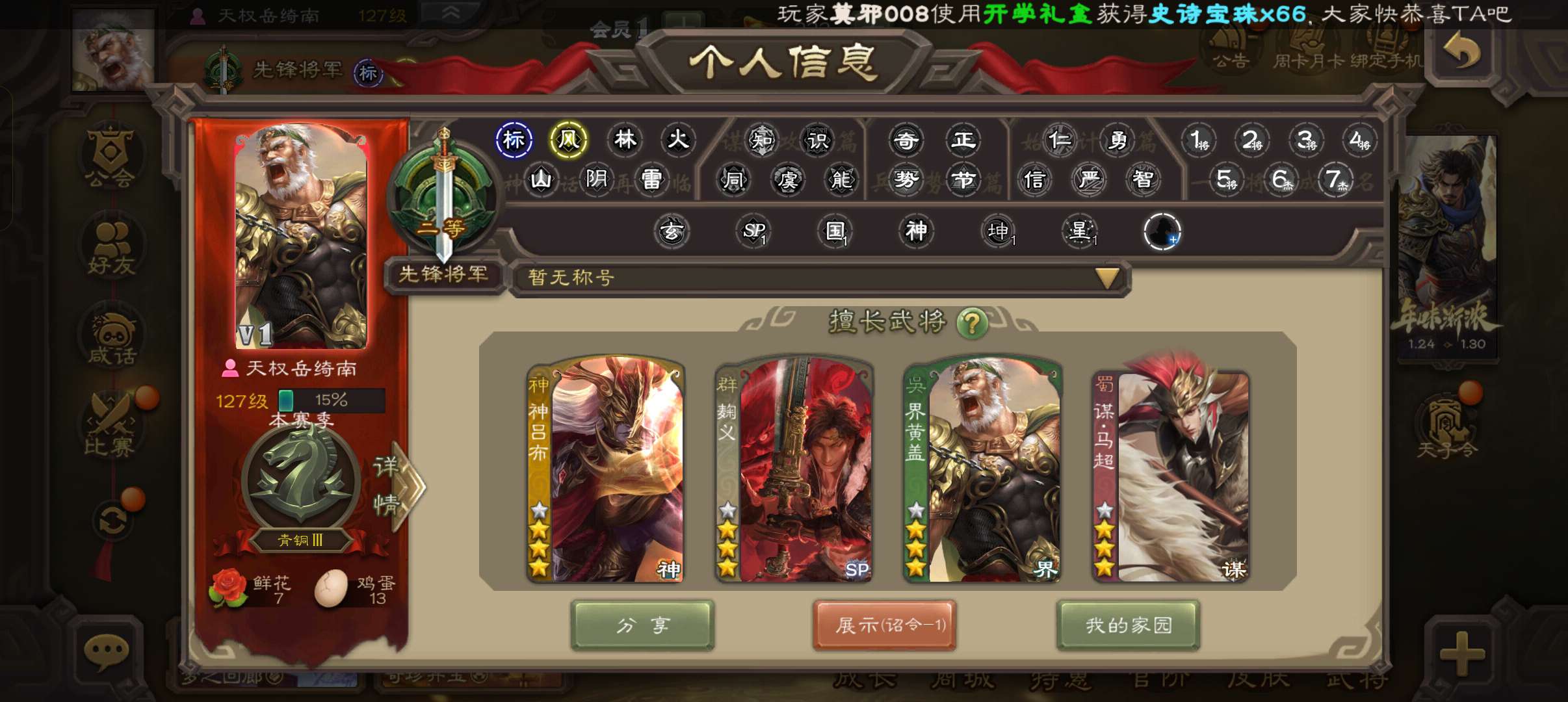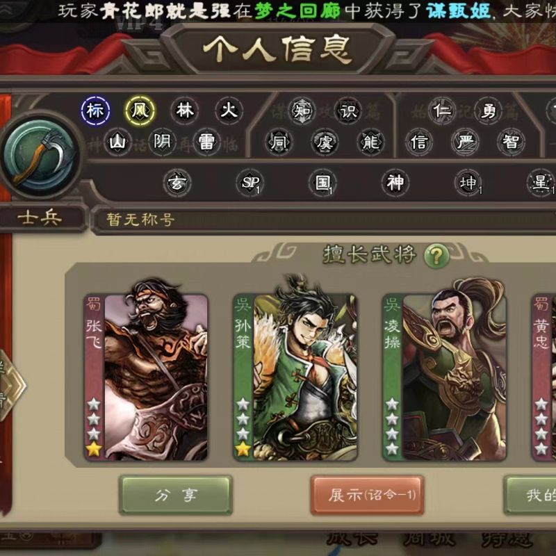 5.7万羽毛4.4万豆,玉龙回廊动白马界钟会吴景谯周4史诗先锋,神吕蒙谋高顺甘夫人崔琰界荀彧145将