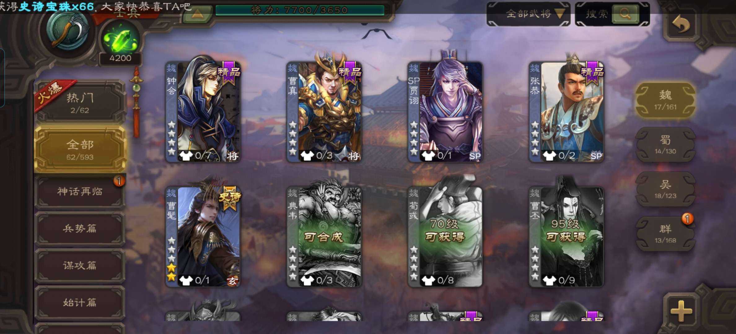 7100将魂7.6万羽毛6万豆,带皮谋关羽神赵云双史诗先锋,谋韩当界吕布界全琮彭恙147将
