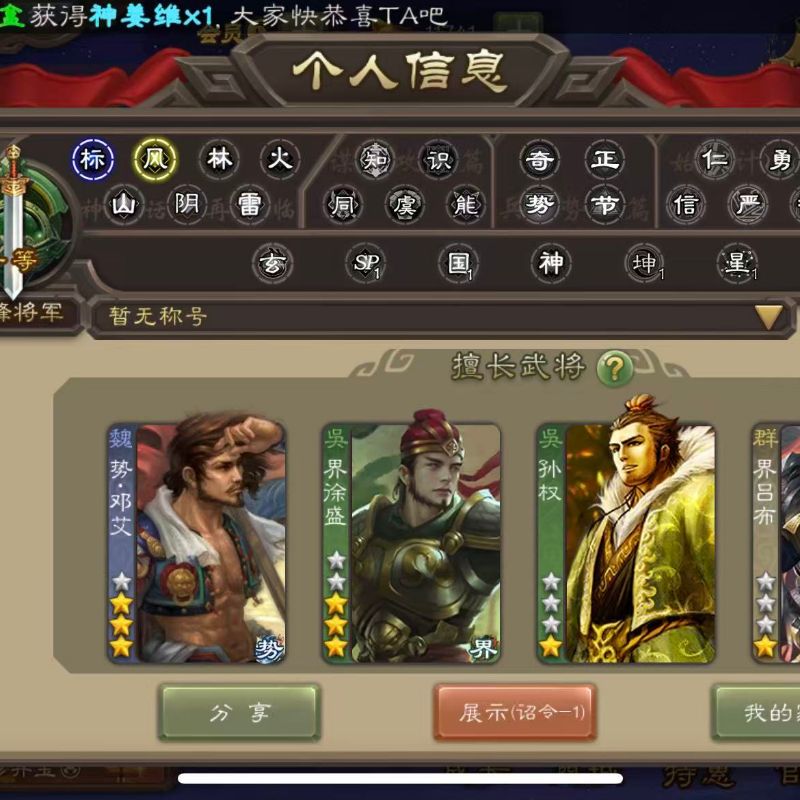 7史诗先锋,4.8万羽毛,谋夏侯惇界钟会沙摩柯神吕布界朱然杨修左慈,桥公崔琰界张嶷界曹休134将