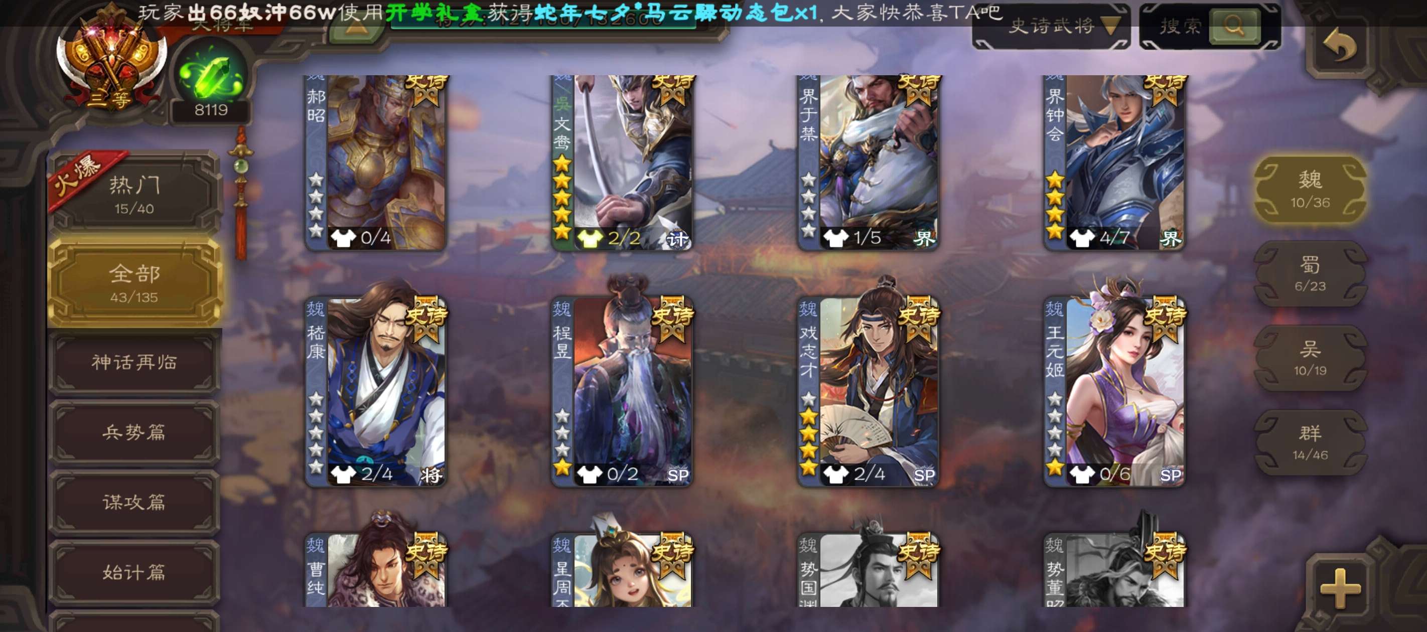 7史诗3神中军,6.6万豆回廊动态张星彩神赵云神吕布界钟会界于禁谯周程昱,神吕蒙甘夫人谋高顺174将