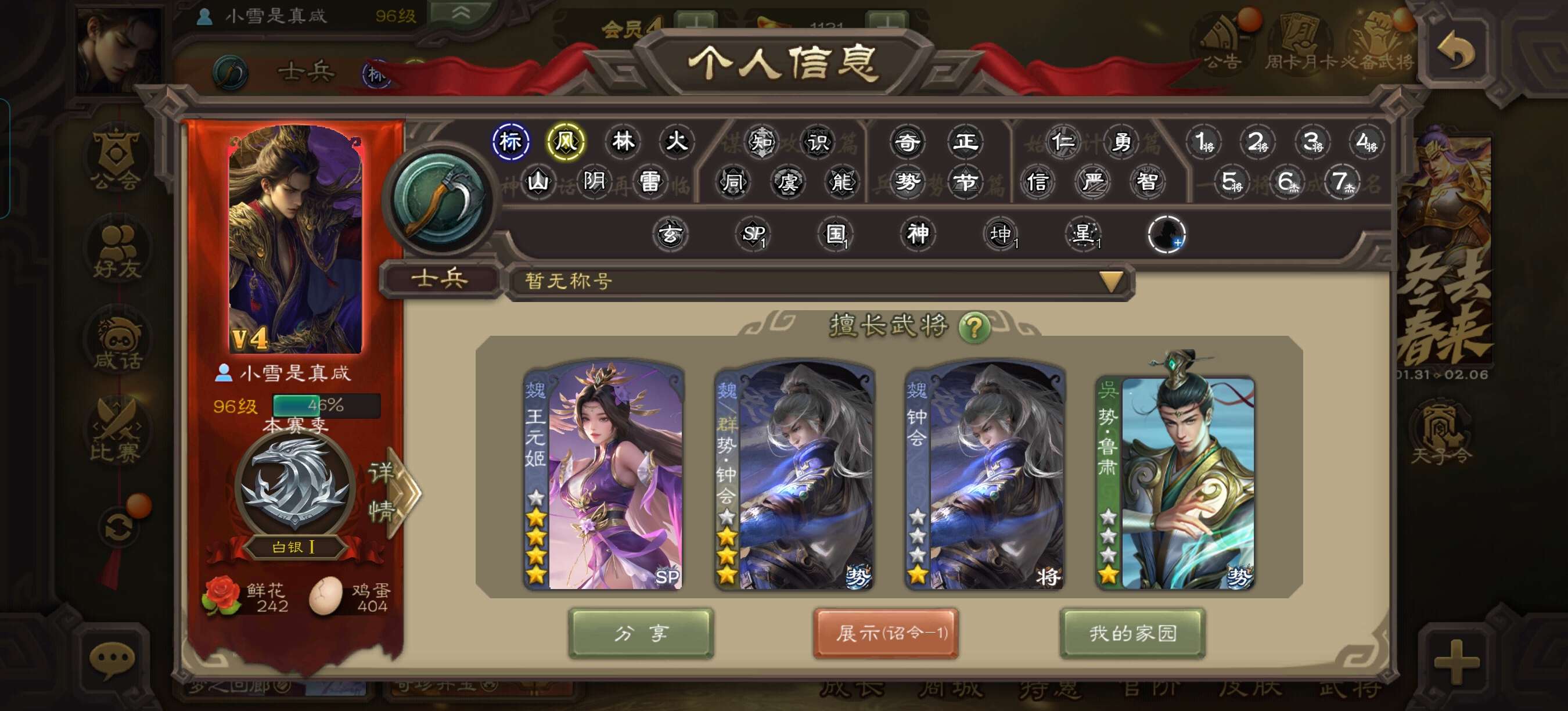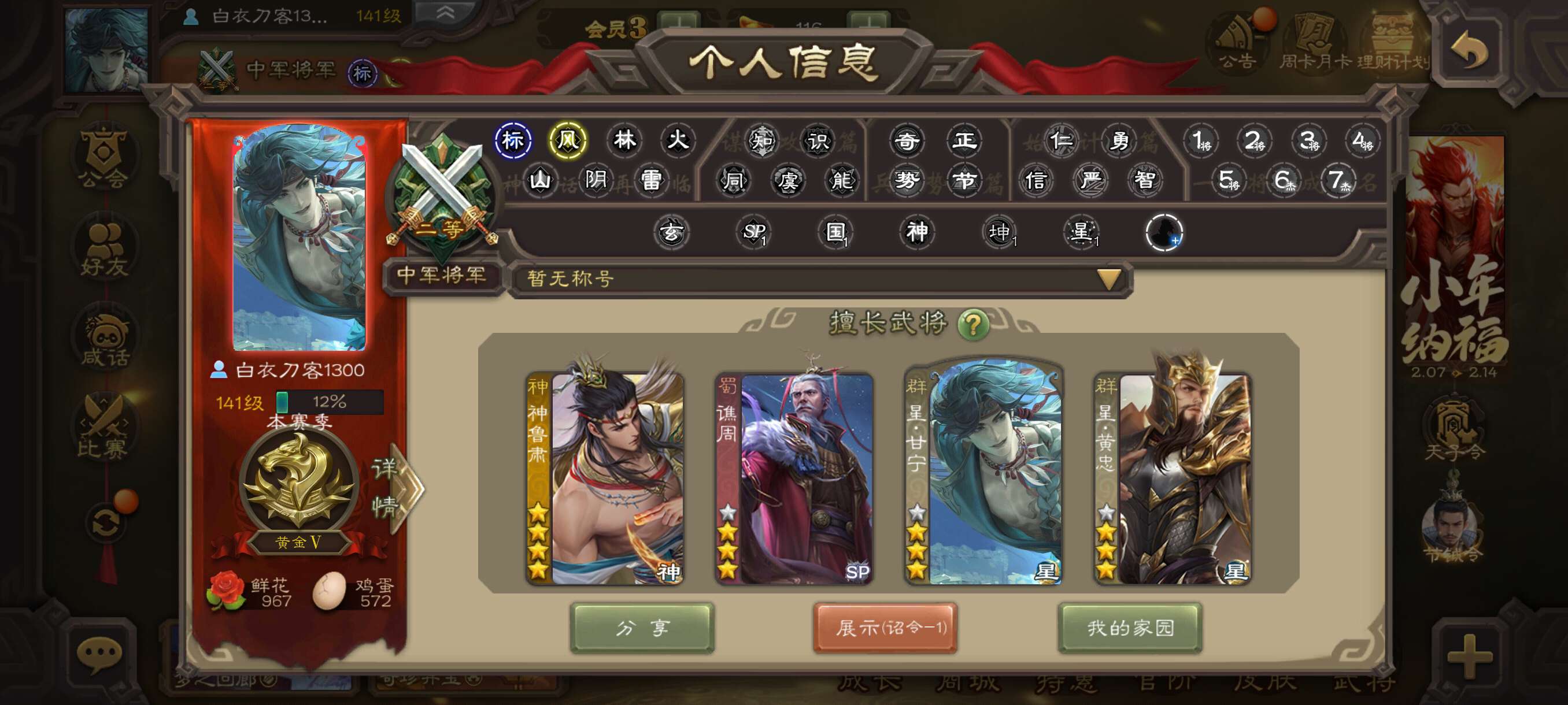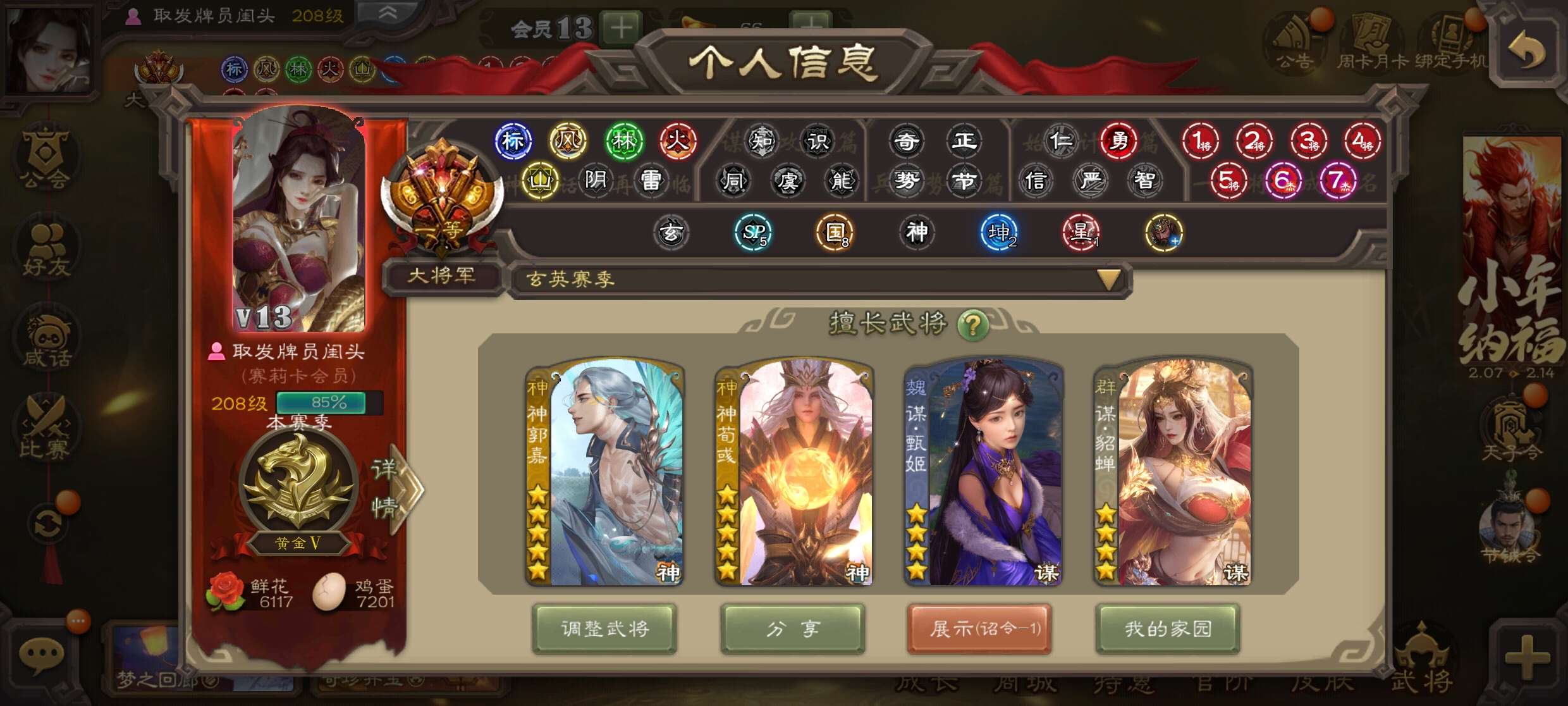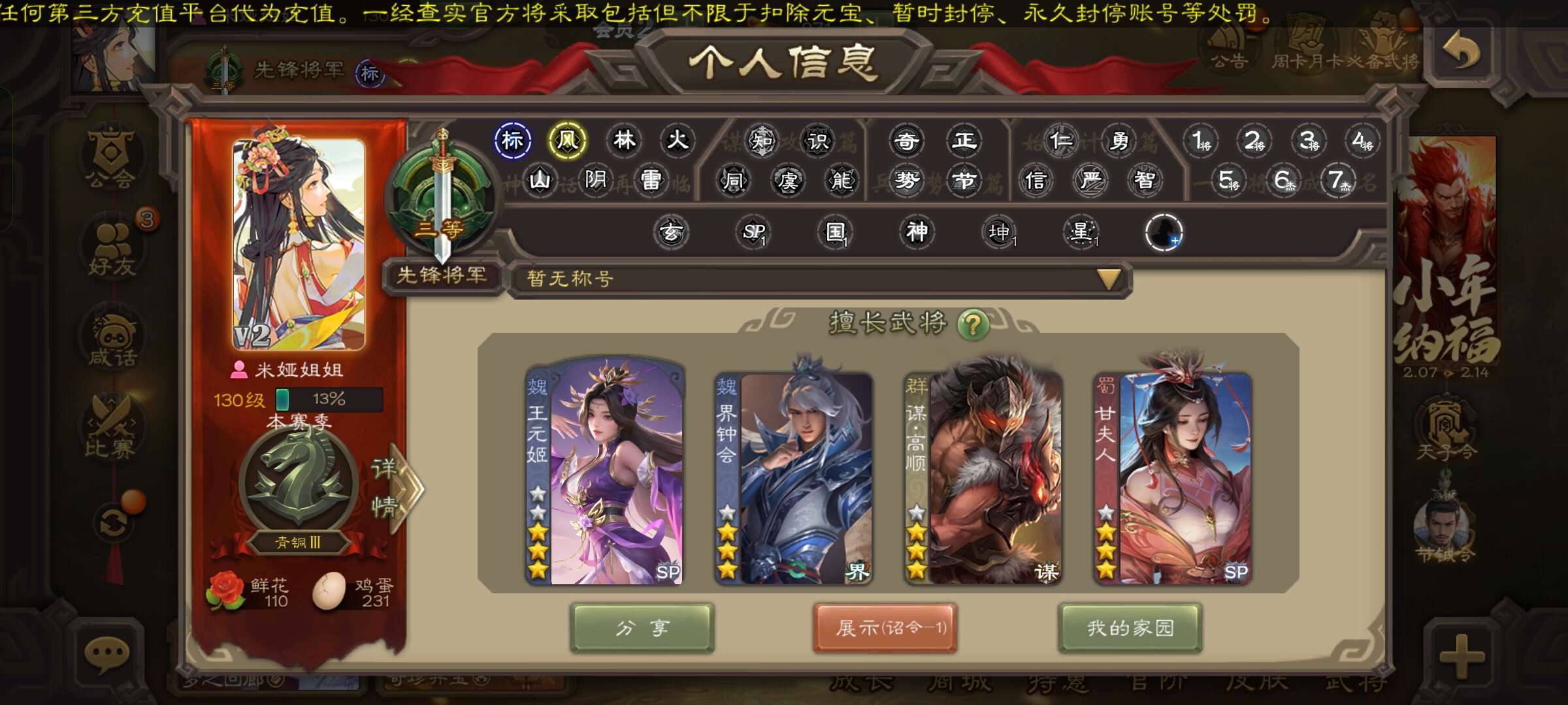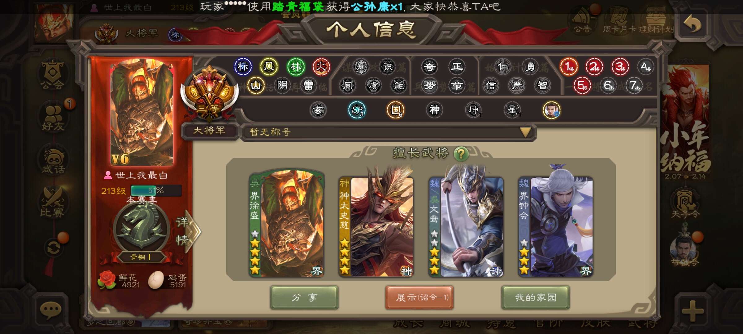 三国杀大将军一等,心愿积分1万4,中过两次66,两次权一。