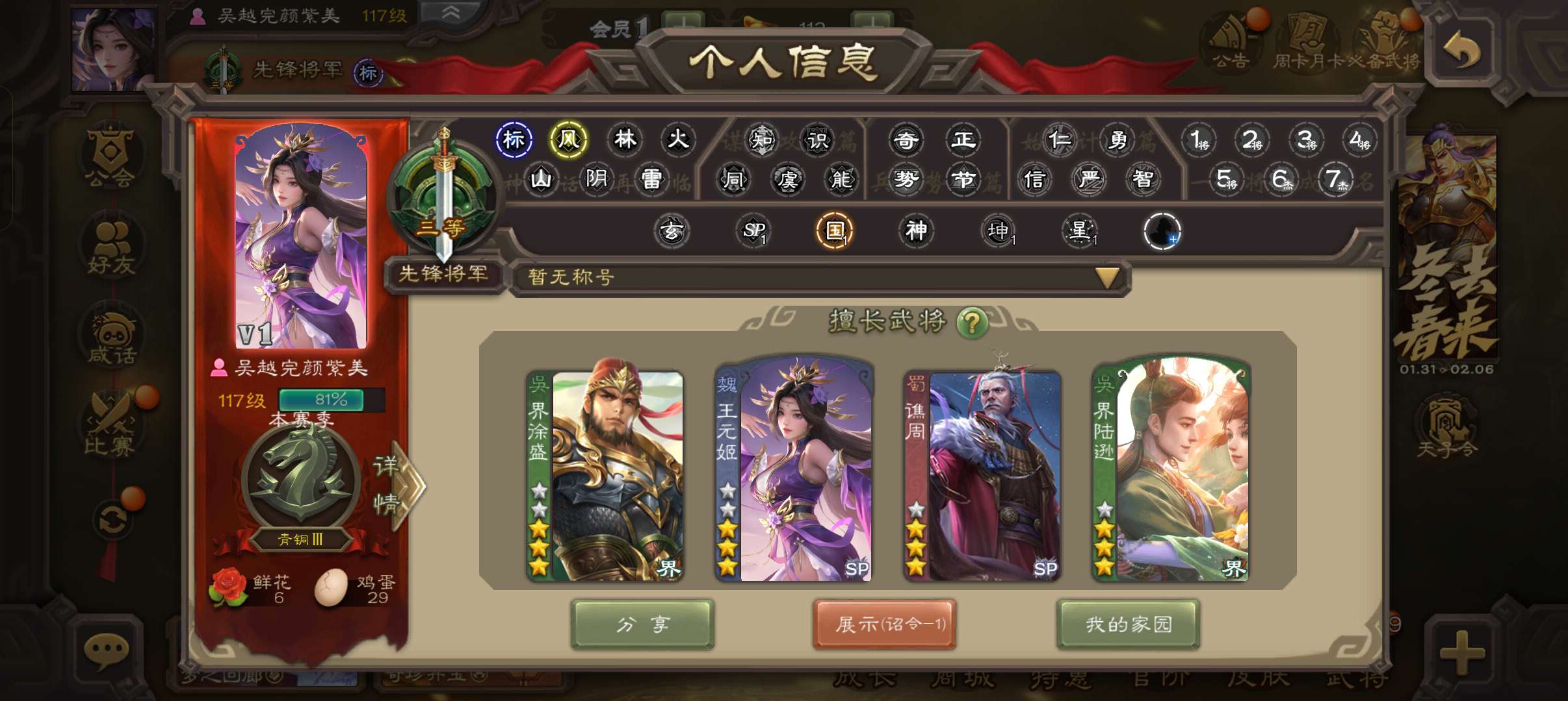 42宝珠9.4万羽毛,王元姬界钟会谯周杨修4史诗先锋。双天工孟达李遗,sp赵云鲁肃动曹冲156将