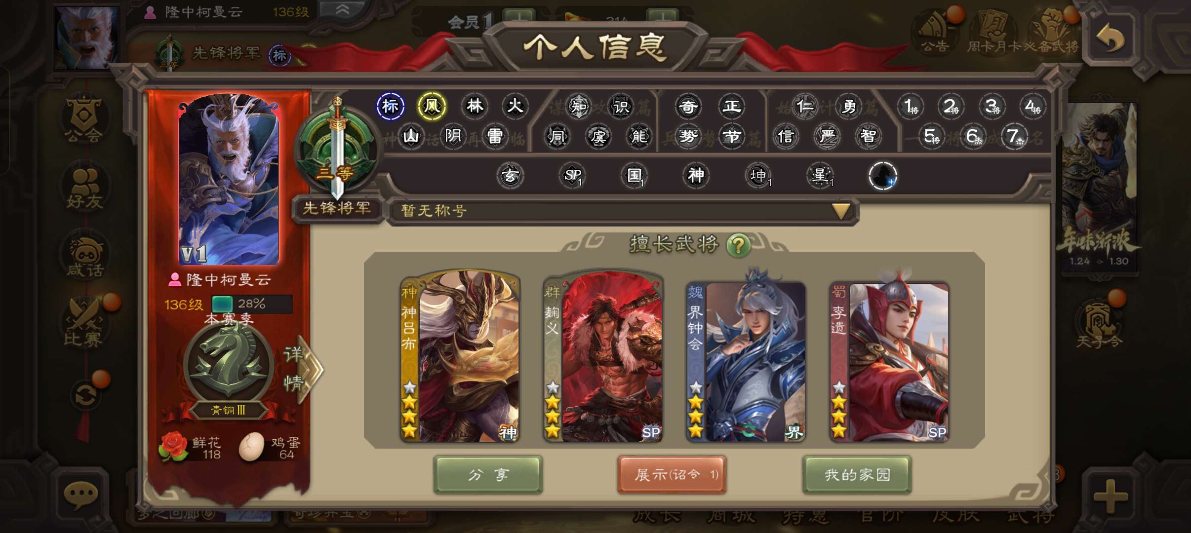 5史诗先锋,6.4万豆4.9万羽毛,天工谋法正,回廊动白马界钟会神刘备花鬘杨修,动界大乔界权148将