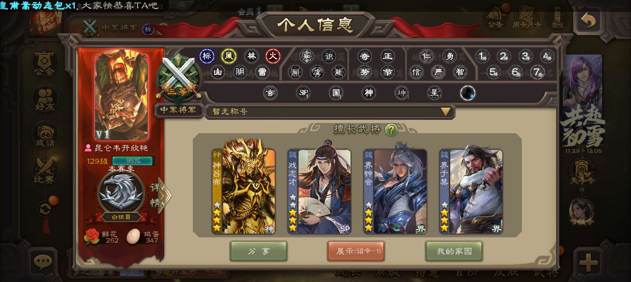 三史诗校尉排位强力小号,孙权荀彧关索武将动皮都有,5.9宝珠,也有大师奖励势夏侯,乐就