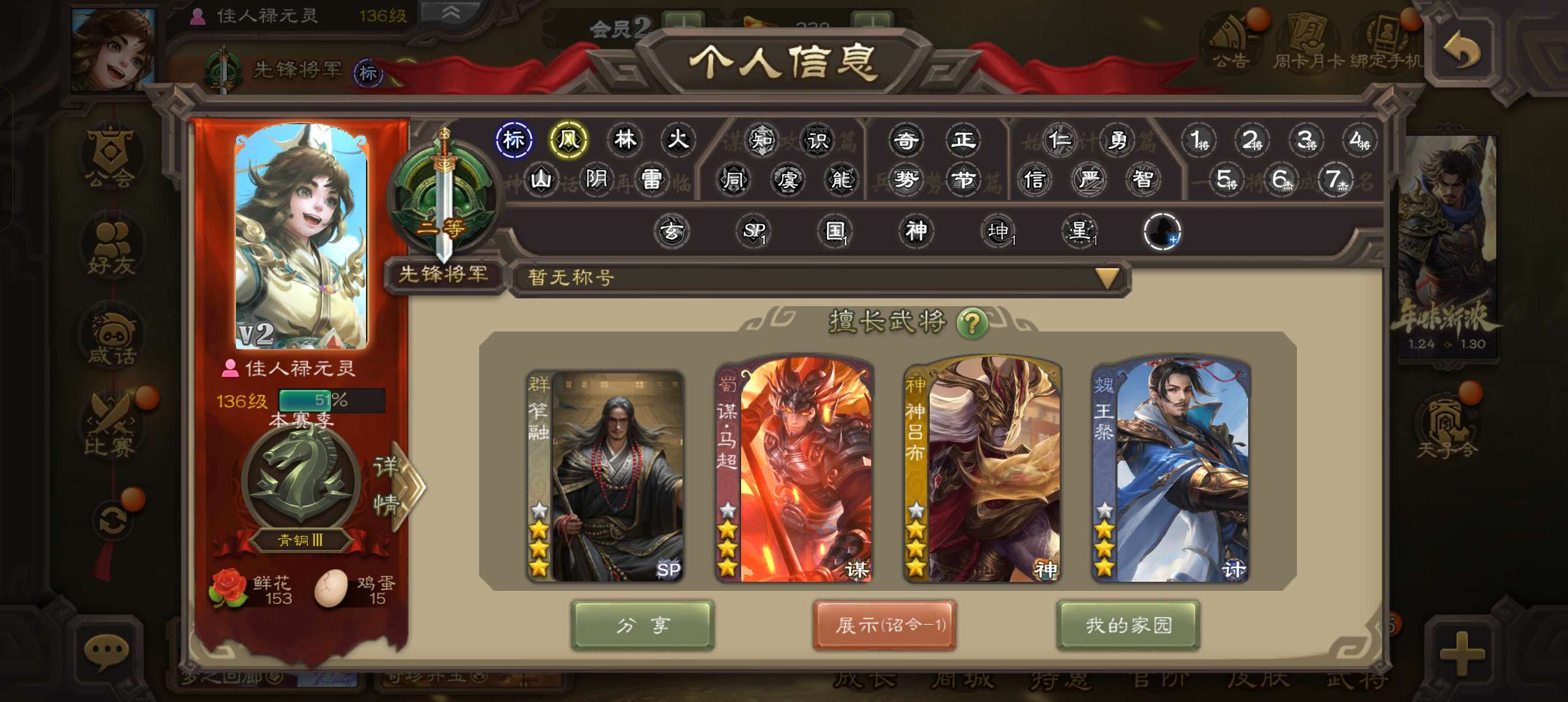 38宝珠8.3万羽毛1.6万将魂7万豆,势于吉神刘备谯周3史诗先锋,sp赵云鲁肃关银屏甘夫人154将