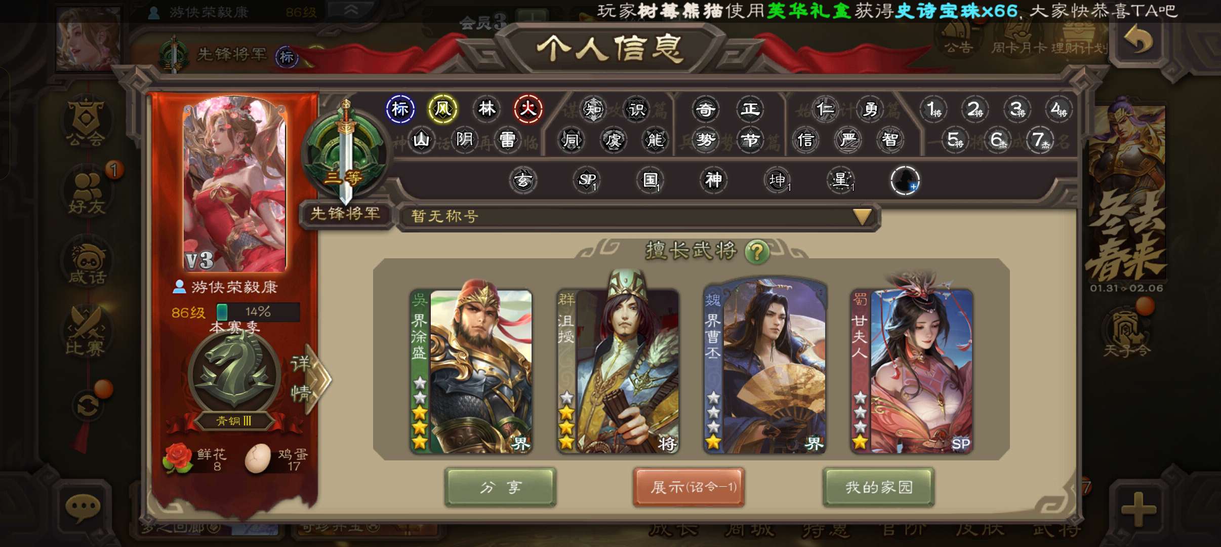 8万2羽毛1.36万将魂,大宝界徐盛沮授双史诗先锋,动界曹丕甘夫人谋韩当谋高顺谋小乔桥公崔琰147将