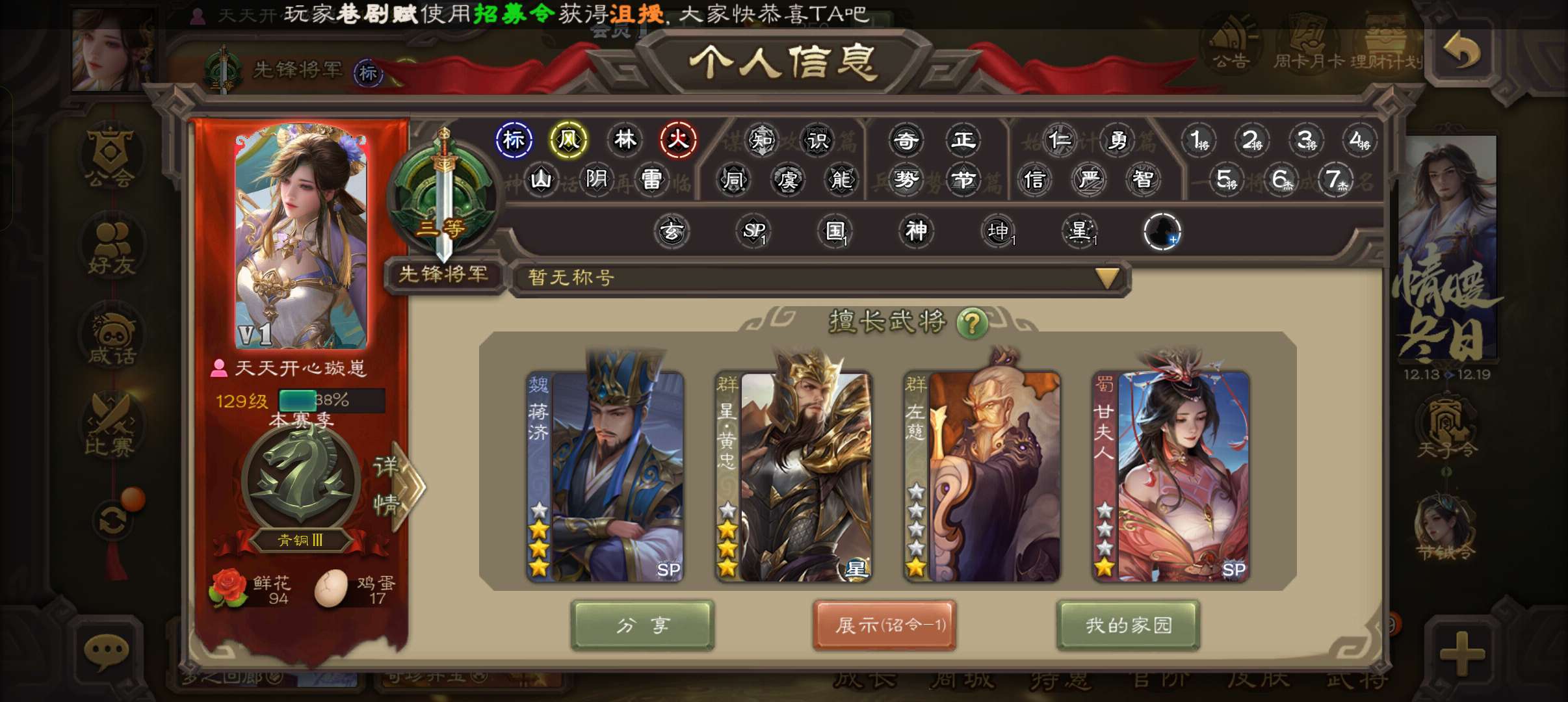 三等大将军 1.2w心愿积分 势太史慈/老宝/大鬼/裴秀/大宝/小鸟/老宝/曹髦
