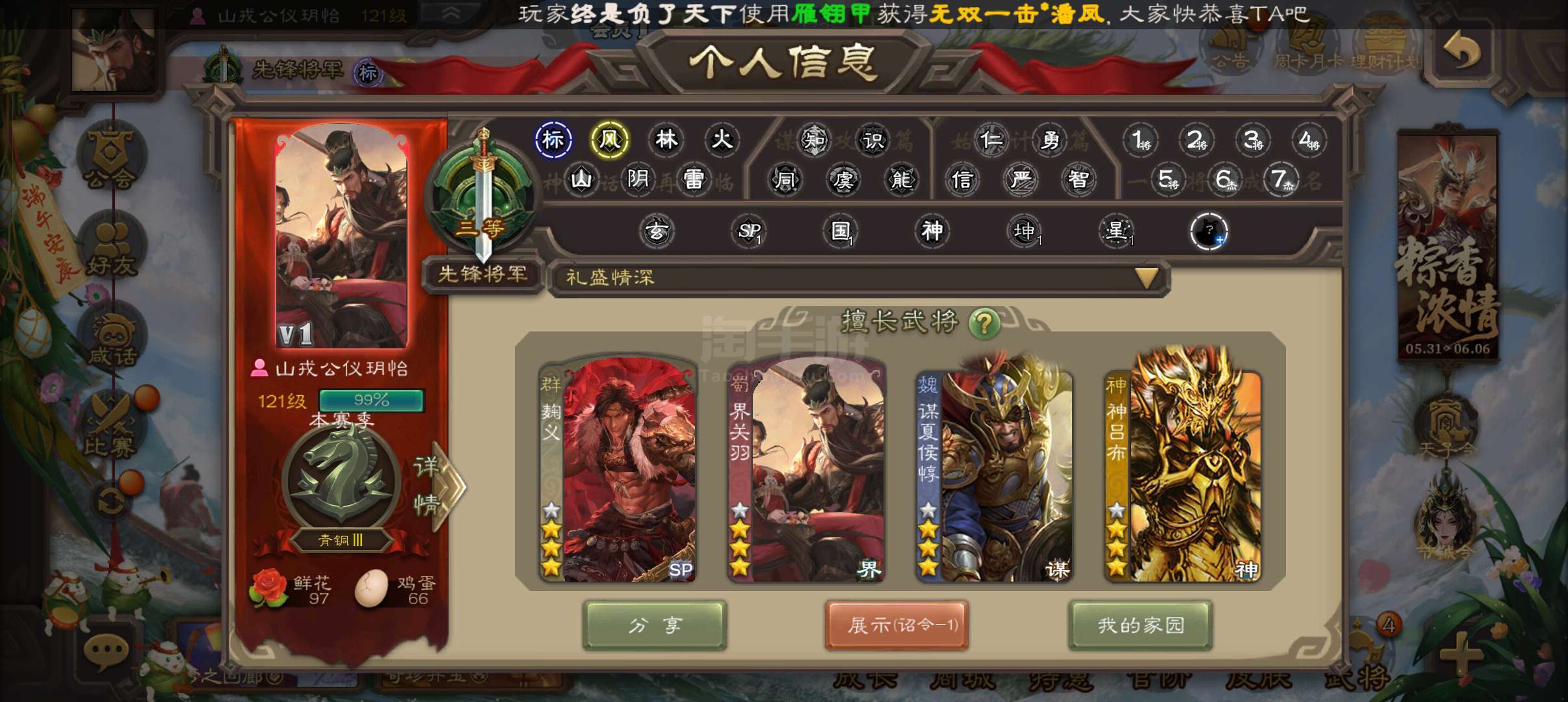 先锋将军,4.6万羽毛,戏志才王平杨修3史诗,神吕蒙神周瑜谋韩当谋高顺崔琰界荀彧张布137将