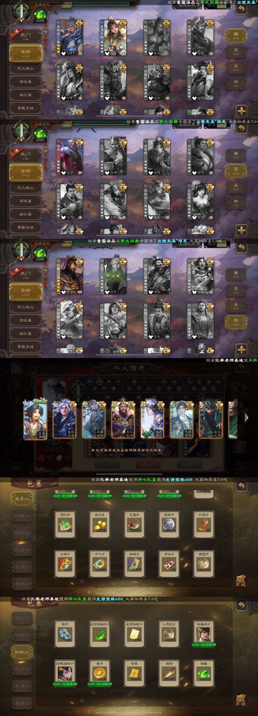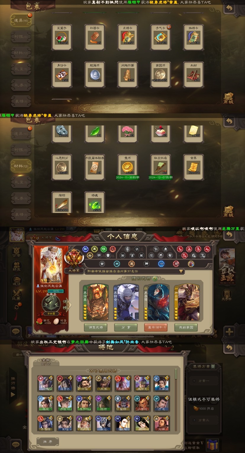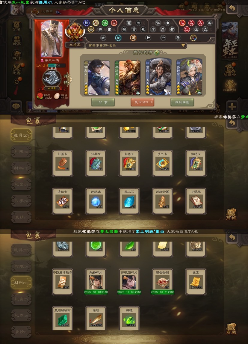 VIP等级: VIP9 官阶: 大将军 武将数量: 339 动态皮肤数量: 3