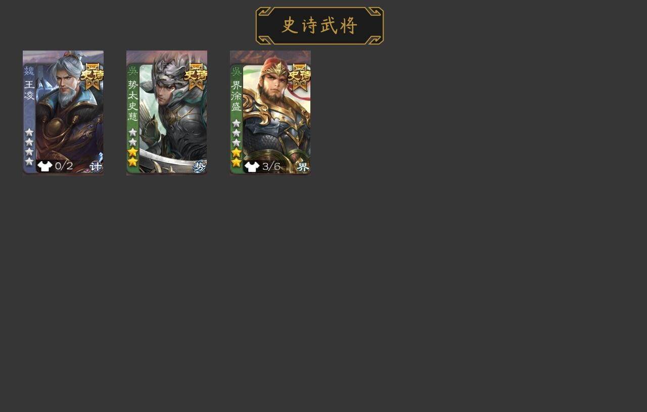 官阶:中军将军;VIP等级:VIP6;史诗武将数量:6;动态皮肤数量:3;武将