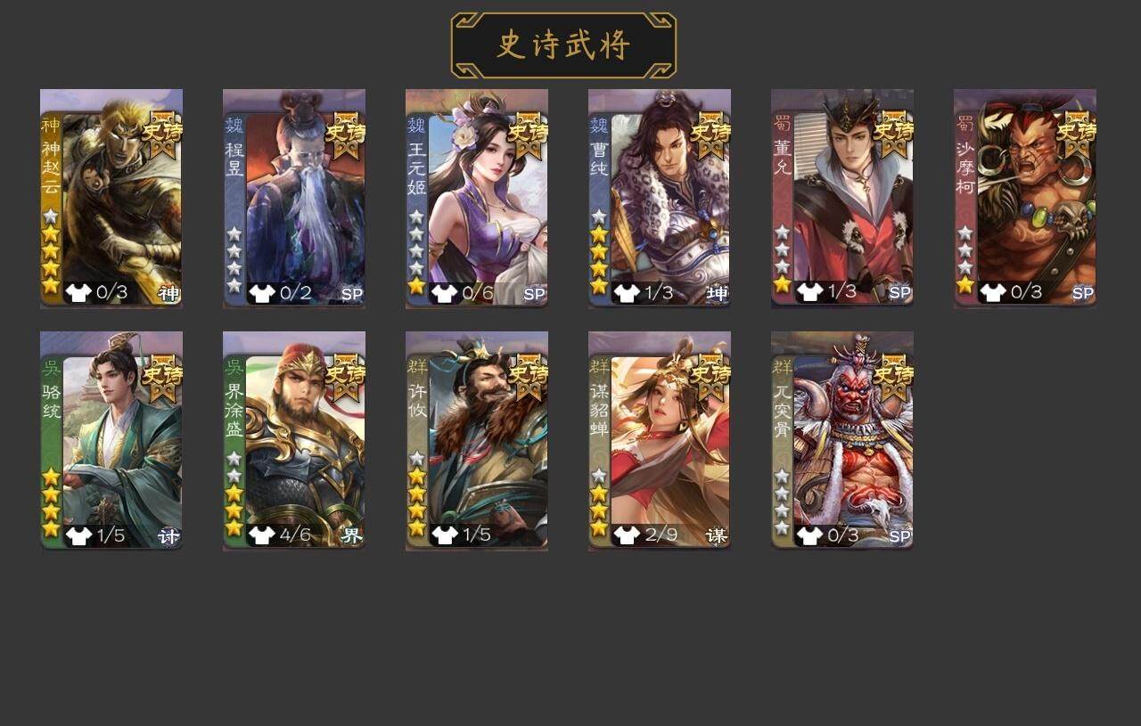 官阶:骠骑将军;VIP等级:VIP5;史诗武将数量:0;动态皮肤数量:9;武将