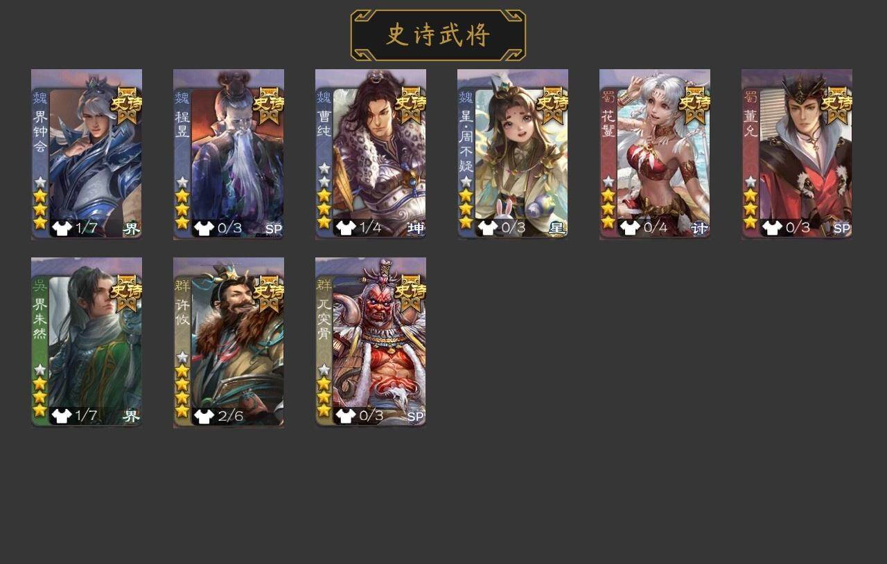 官阶:骠骑将军 VIP等级:VIP6级 史诗武将数:9 动态皮肤数:14 武将