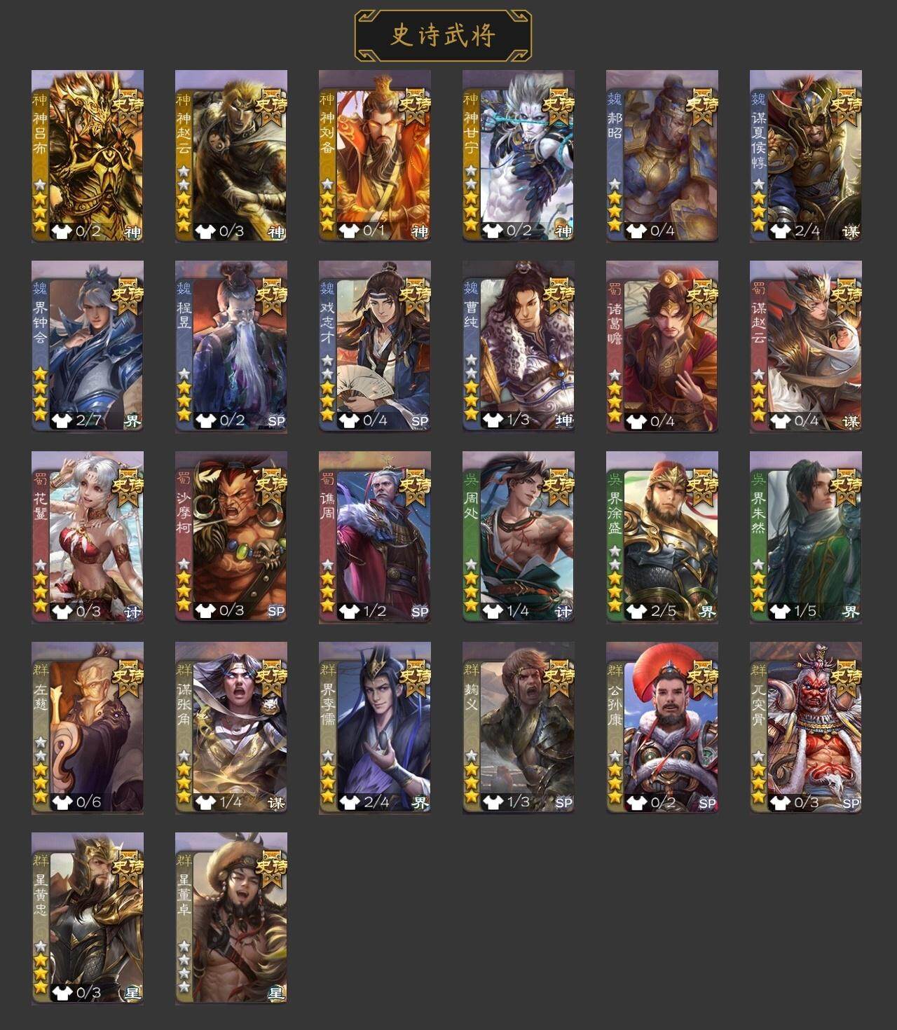 官阶:骠骑将军;VIP等级:VIP7;史诗武将数量:26;动态皮肤数量:25;