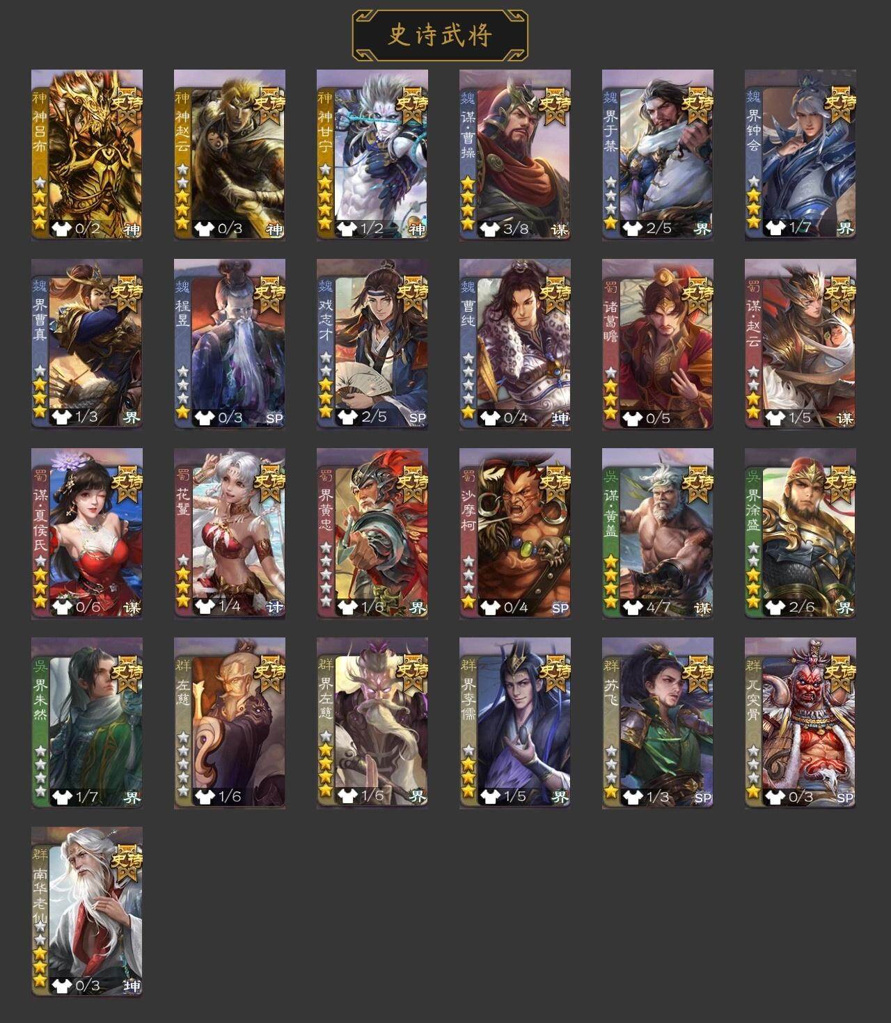 官阶:中军将军;VIP等级:VIP8;史诗武将数量:9;动态皮肤数量:9;武将