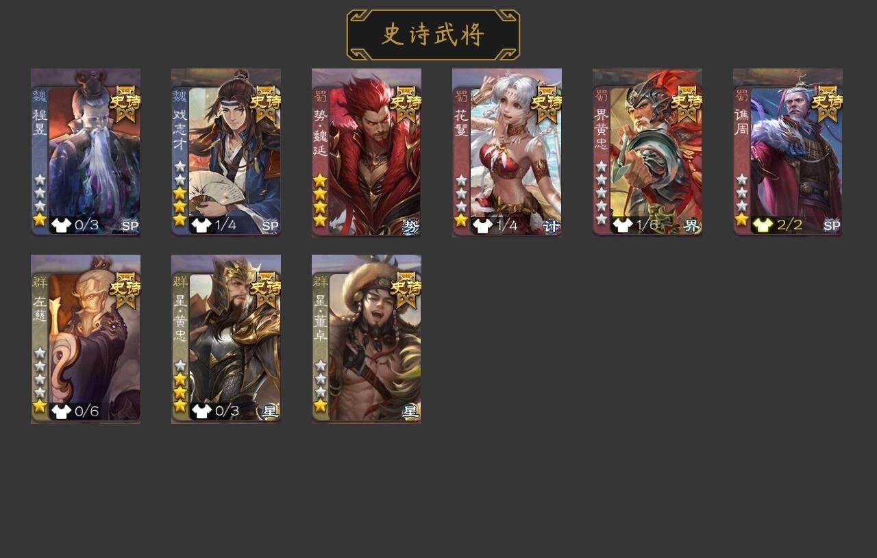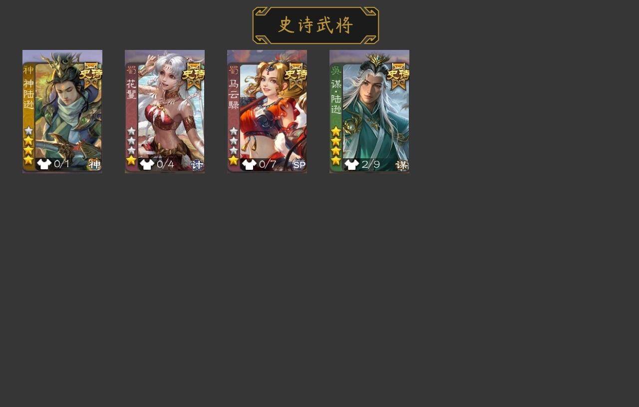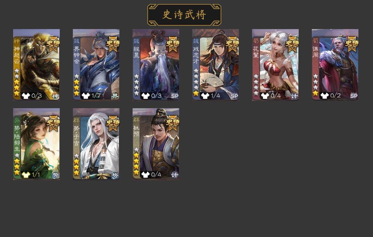 官阶:中军将军;VIP等级:VIP4;史诗武将数量:9;动态皮肤数量:2;武将