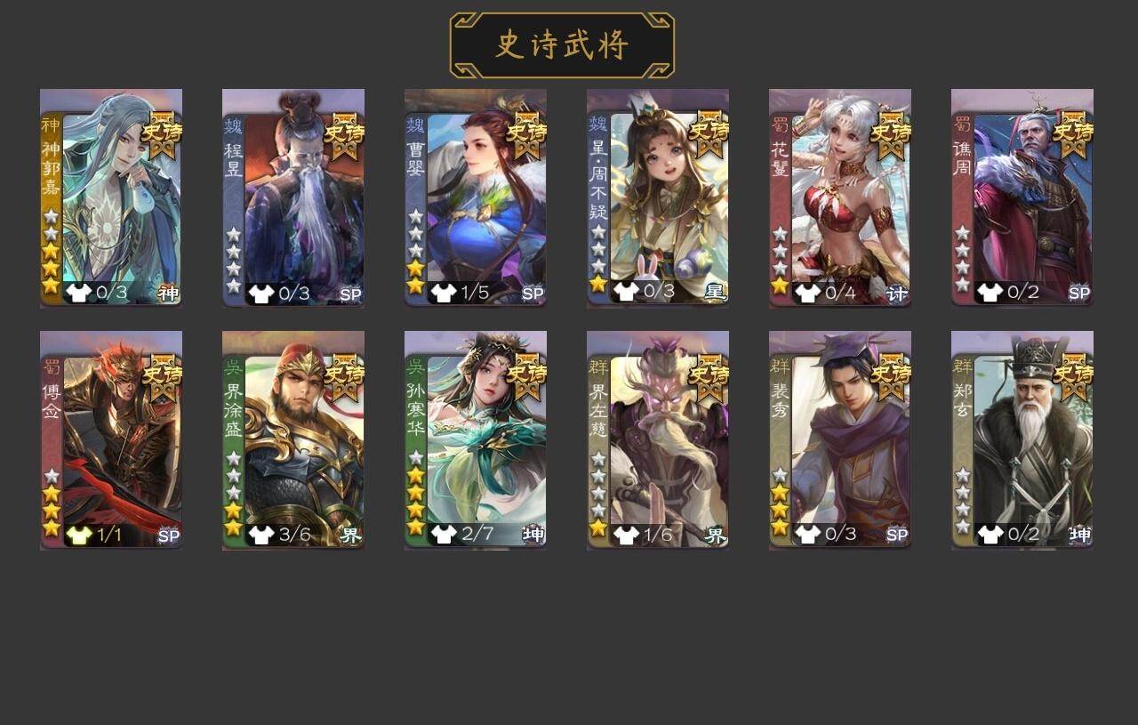 官阶:中军将军;VIP等级:VIP6;史诗武将数量:12;动态皮肤数量:4;武