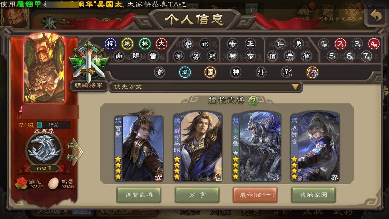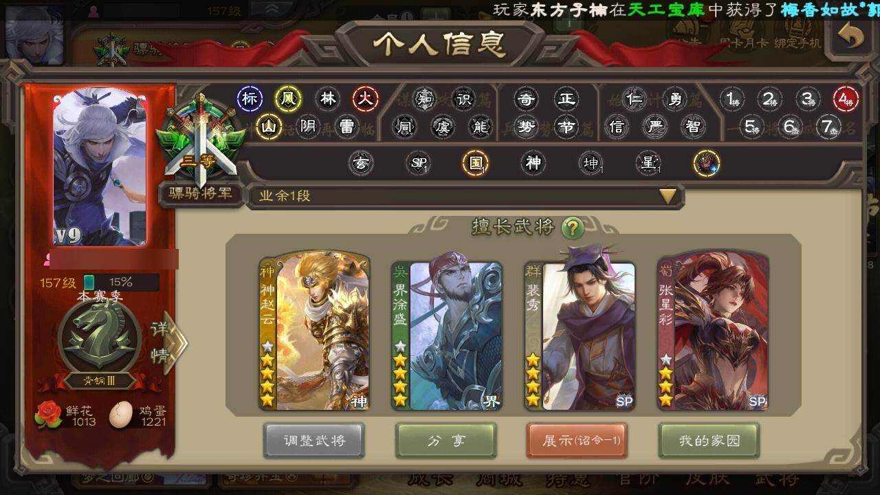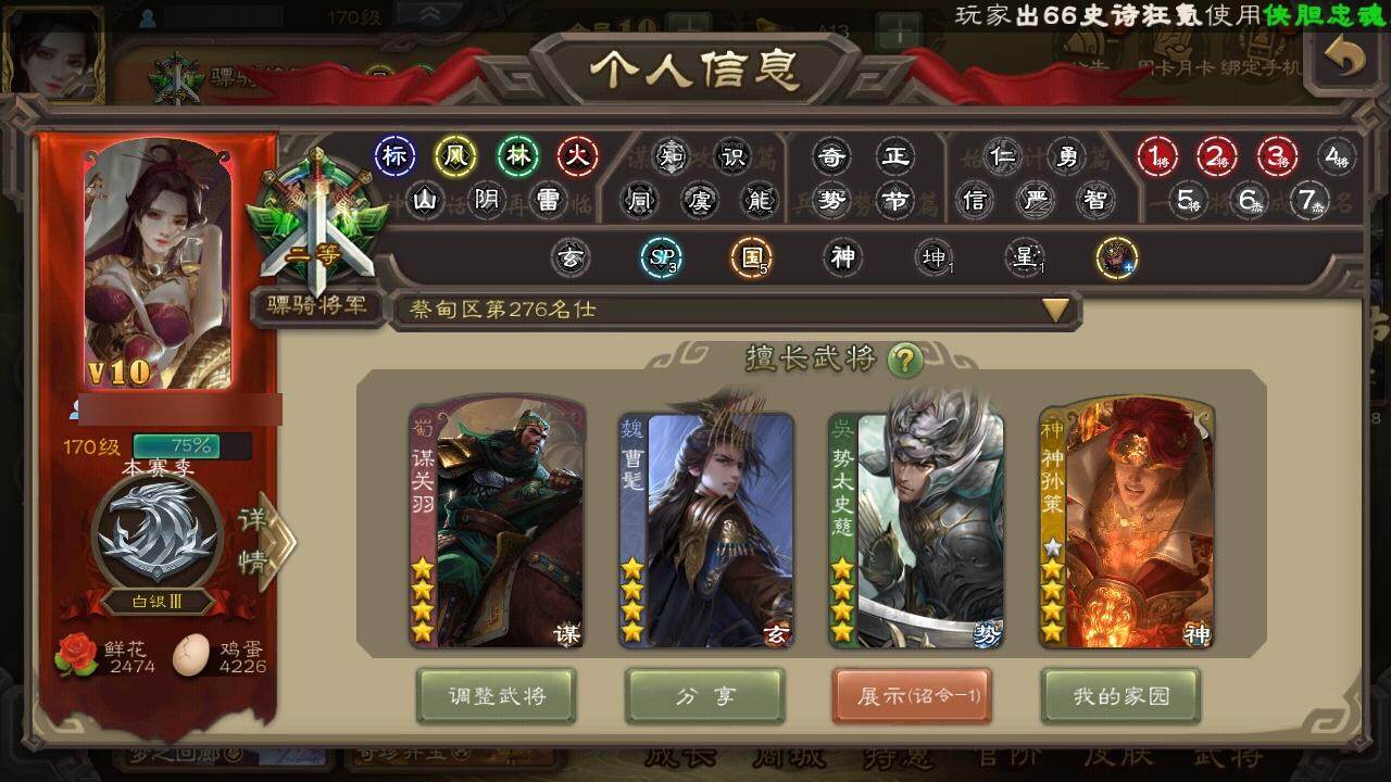 官阶:骠骑将军;VIP等级:VIP9;史诗武将数量:24;动态皮肤数量:38;