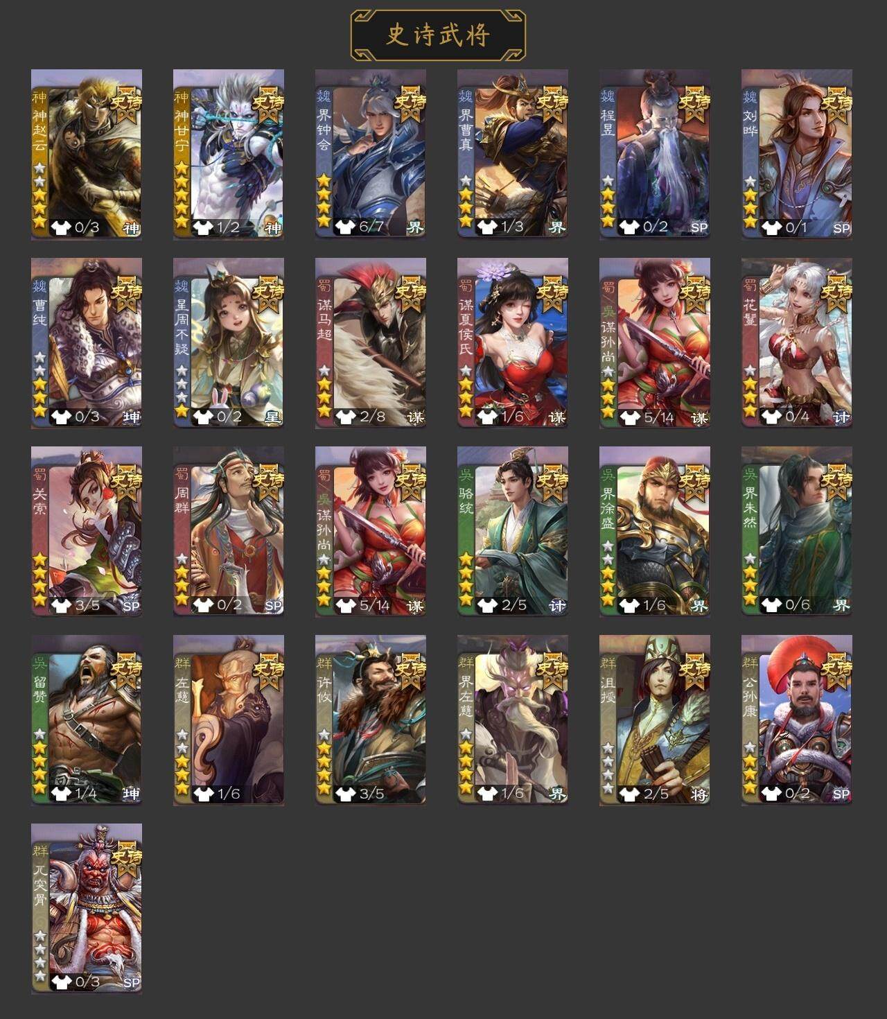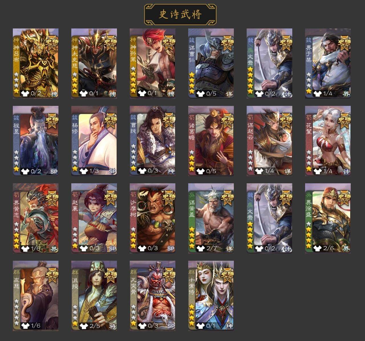 官阶:骠骑将军;VIP等级:VIP9;史诗武将数量:0;动态皮肤数量:29;武