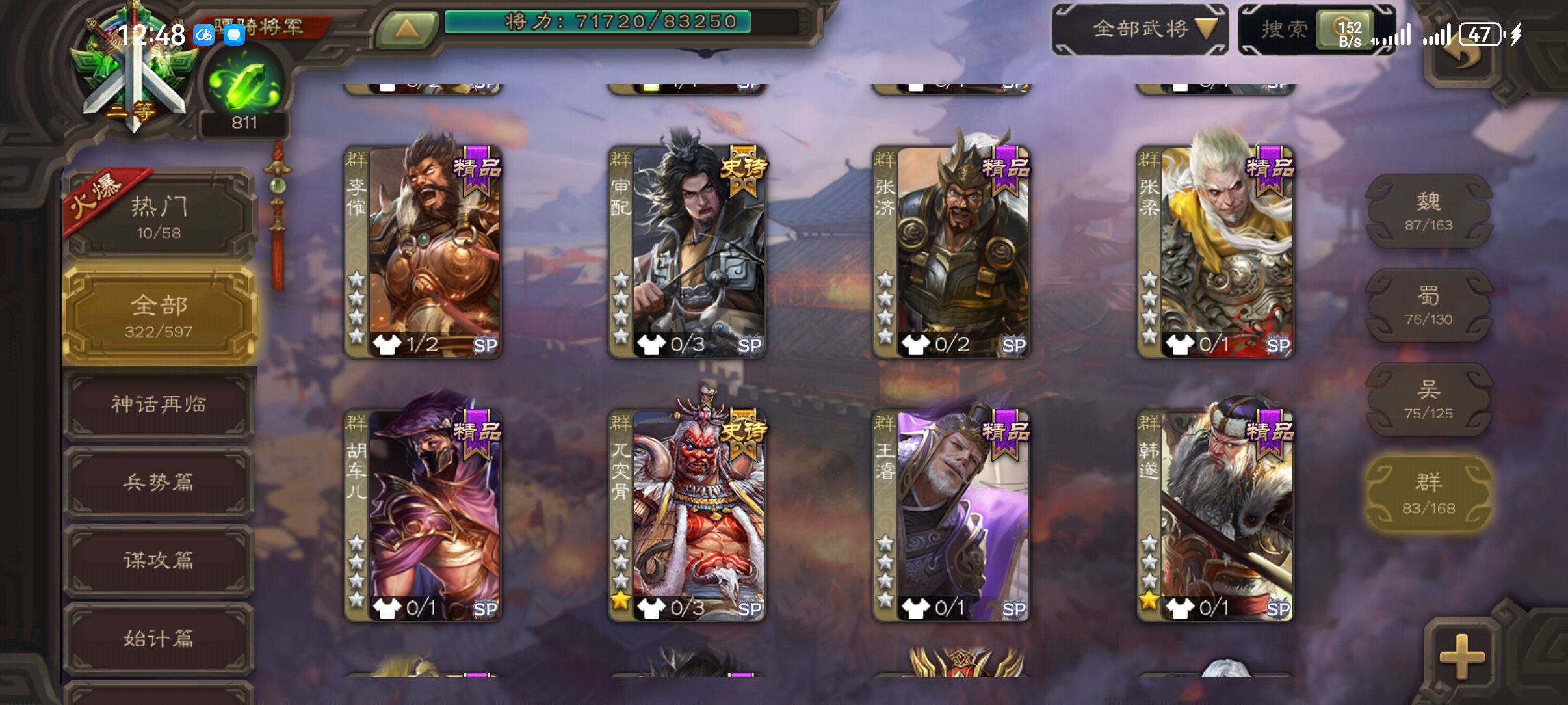官阶:骠骑将军;VIP等级:VIP9;史诗武将数量:12;动态皮肤数量:12;