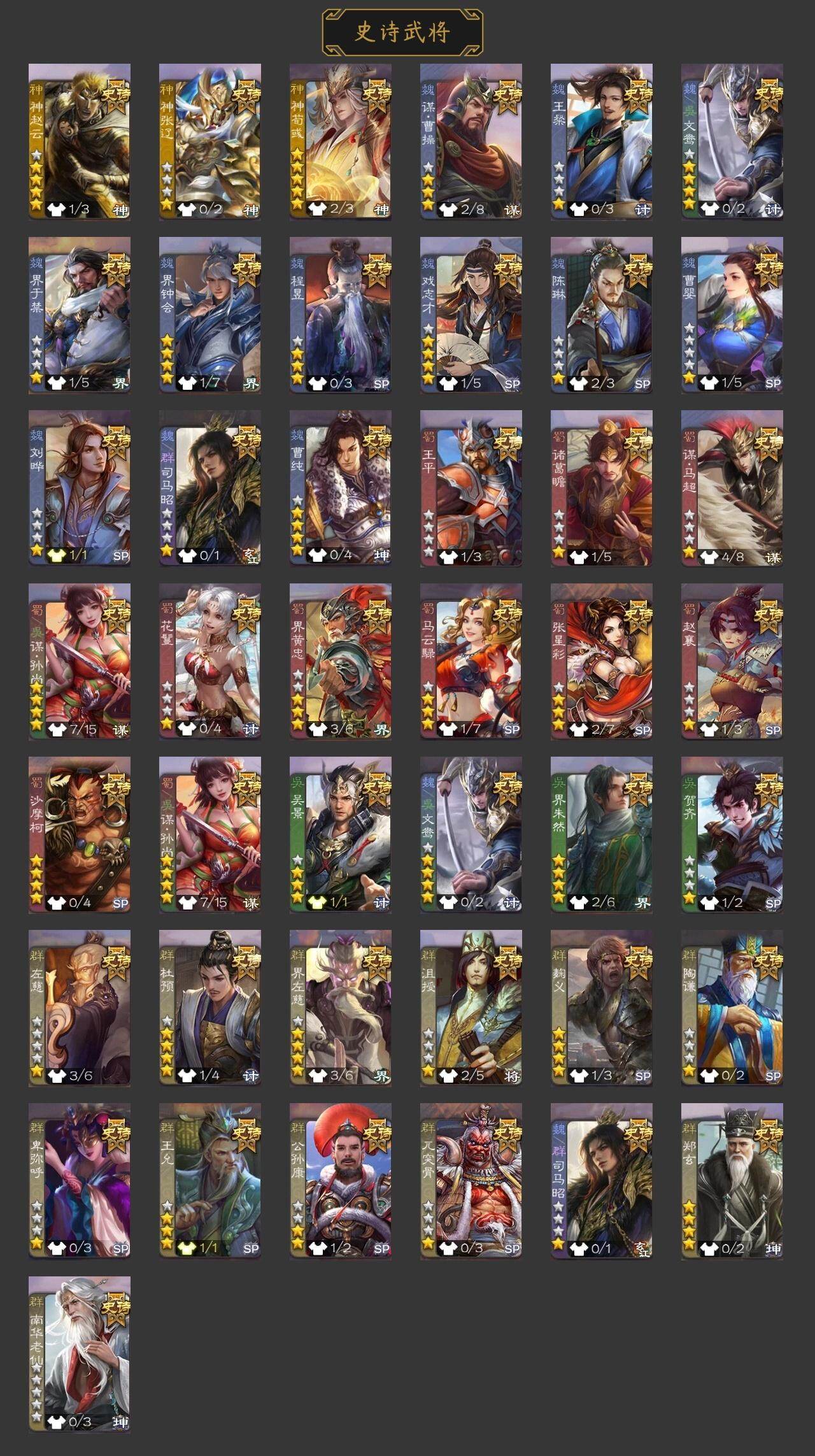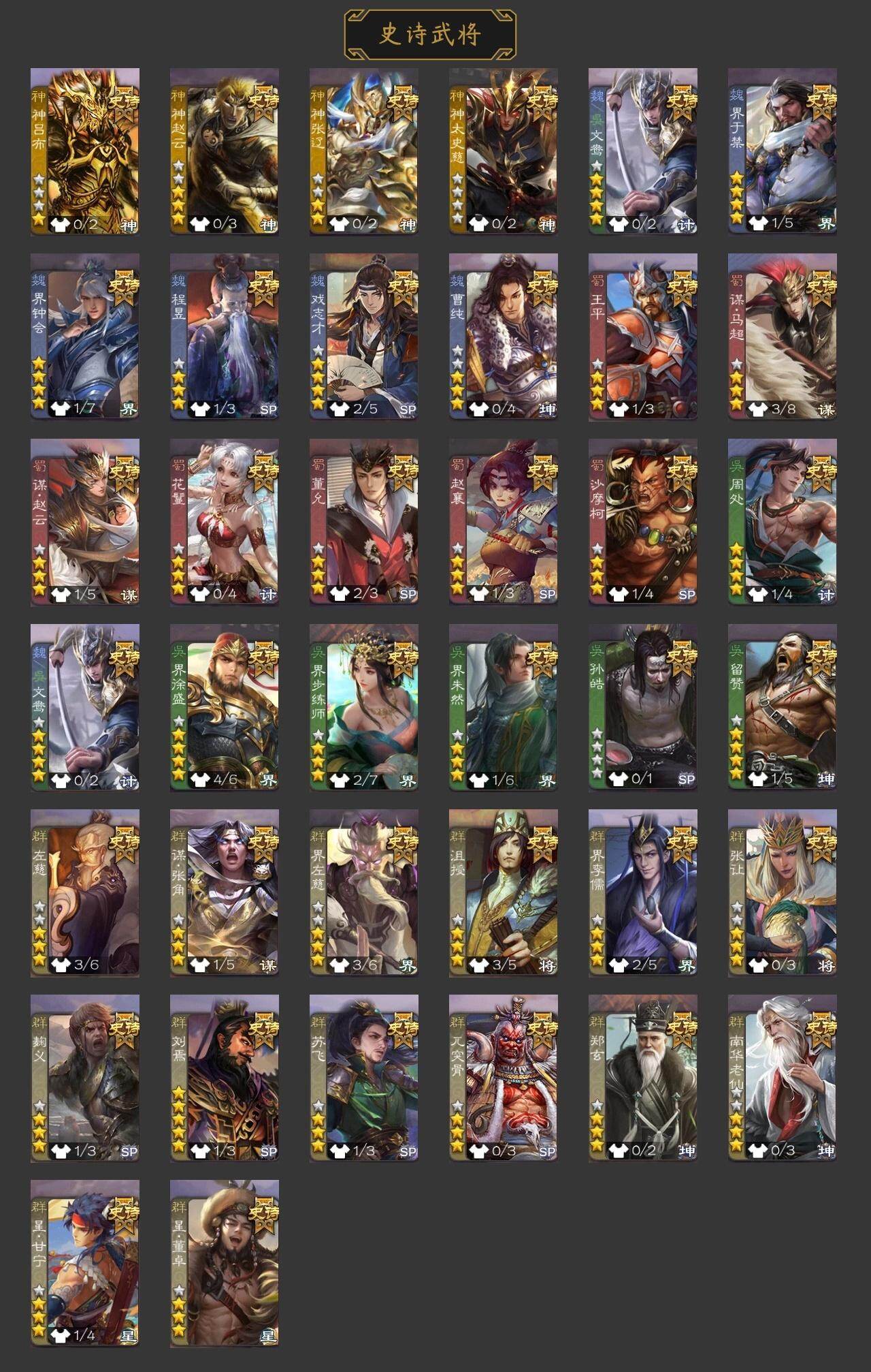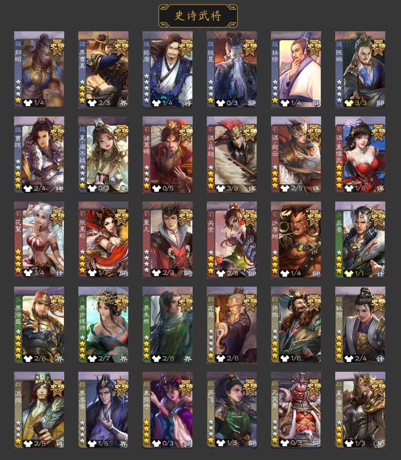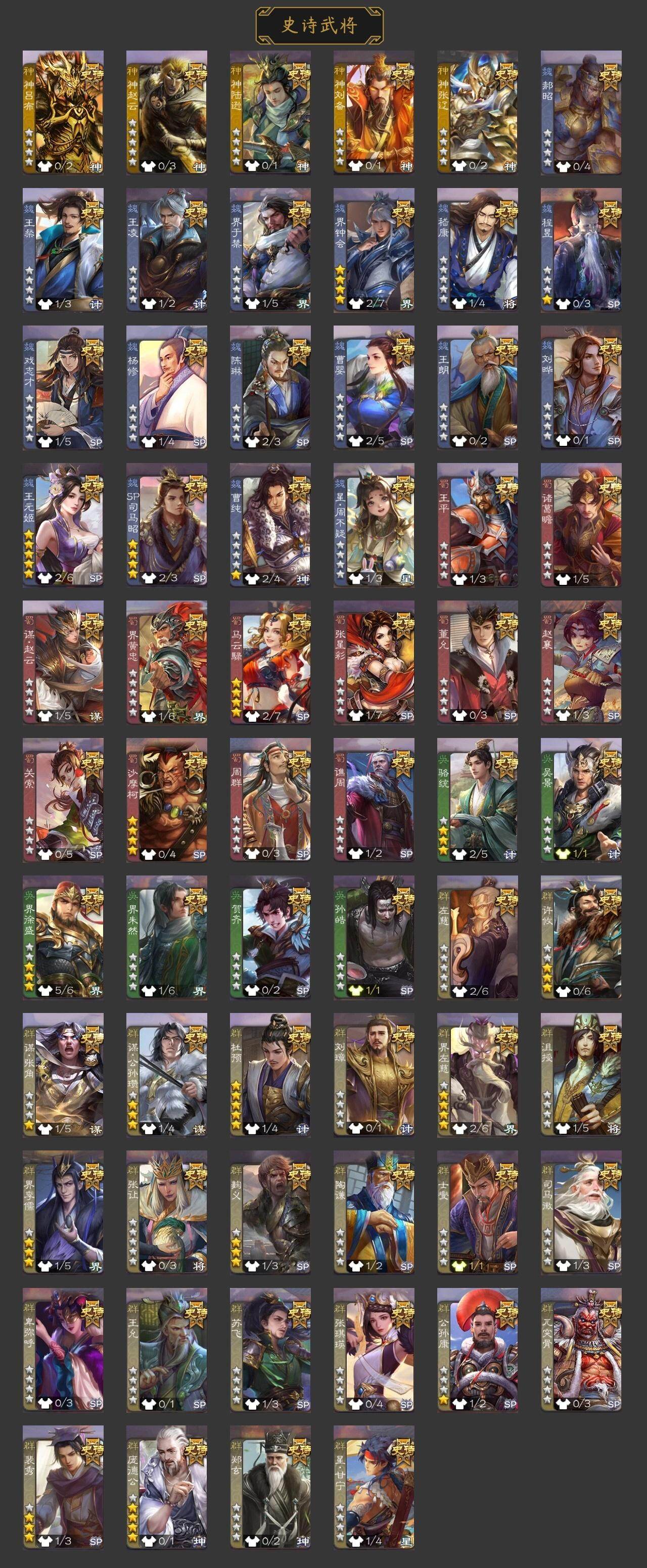 官阶:骠骑将军;VIP等级:VIP4;史诗武将数量:9;动态皮肤数量:6;武将