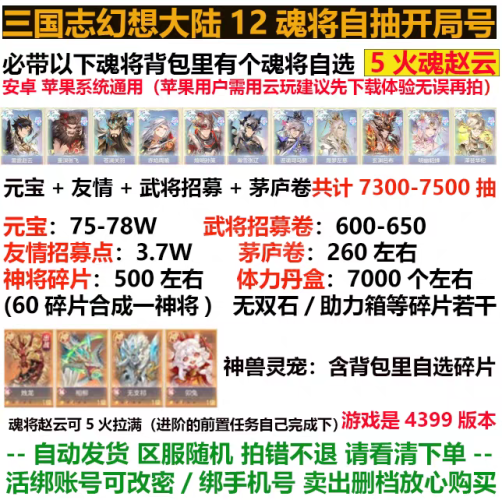 三国志幻想大陆【安卓4399】最高资源❤️7000多抽❤元宝75-78W❤三国志幻想大陆自抽号开局资源号