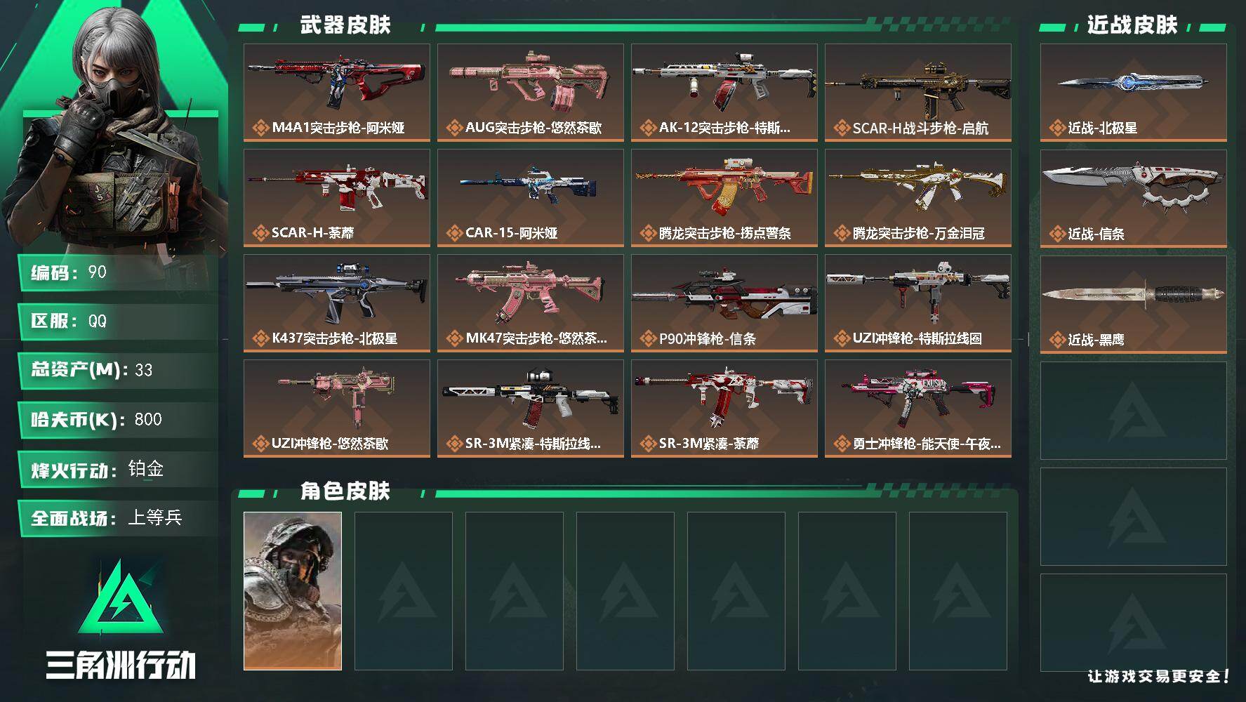 33m总资产-800k哈夫币-60烽火等级-铂金-29战场等级-上等兵【干员