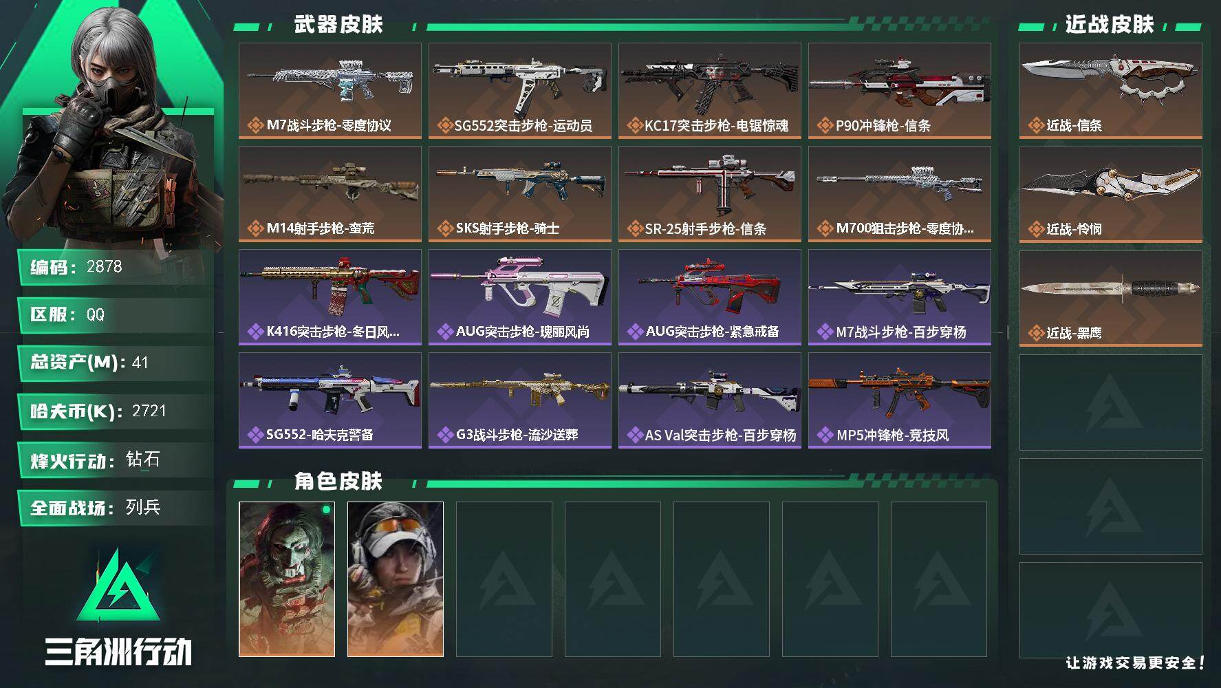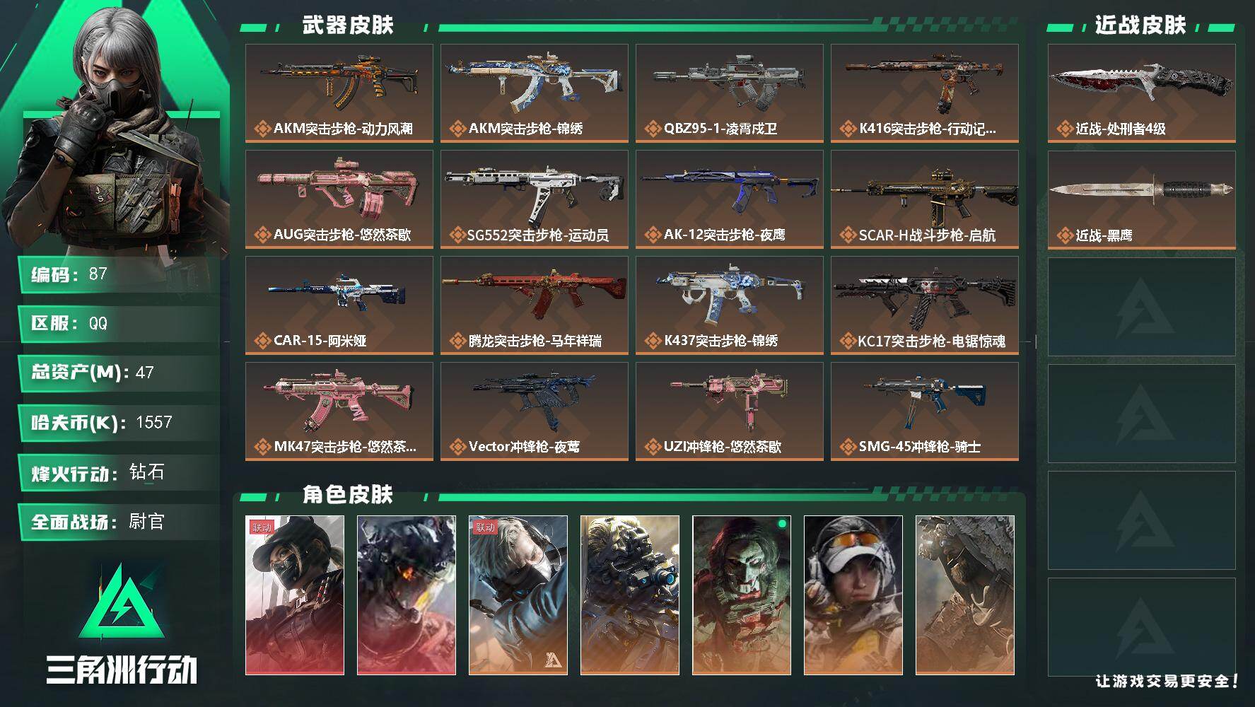 实名: 可修改 烽火地带段位: 铂金 全面战场段位: 上等兵 总资产: 115