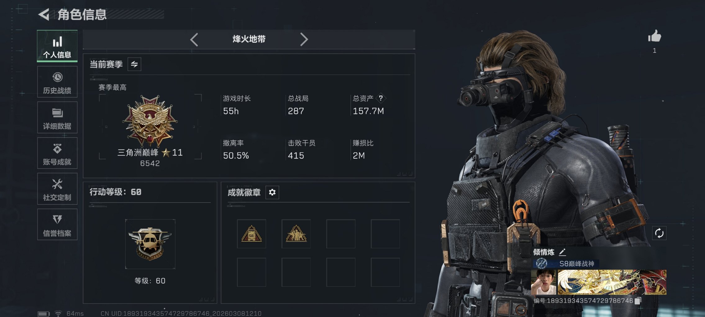264264759m总资产-11k哈夫币-60烽火等级-三角洲巅峰-26战场