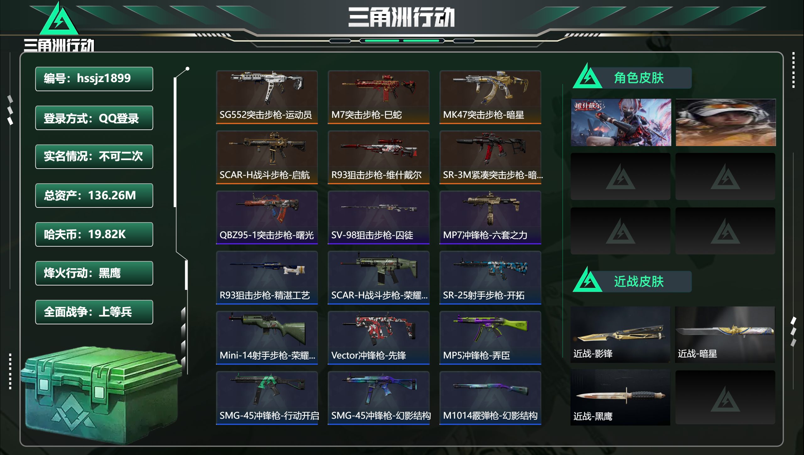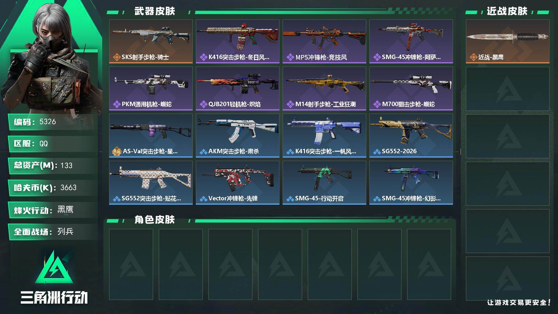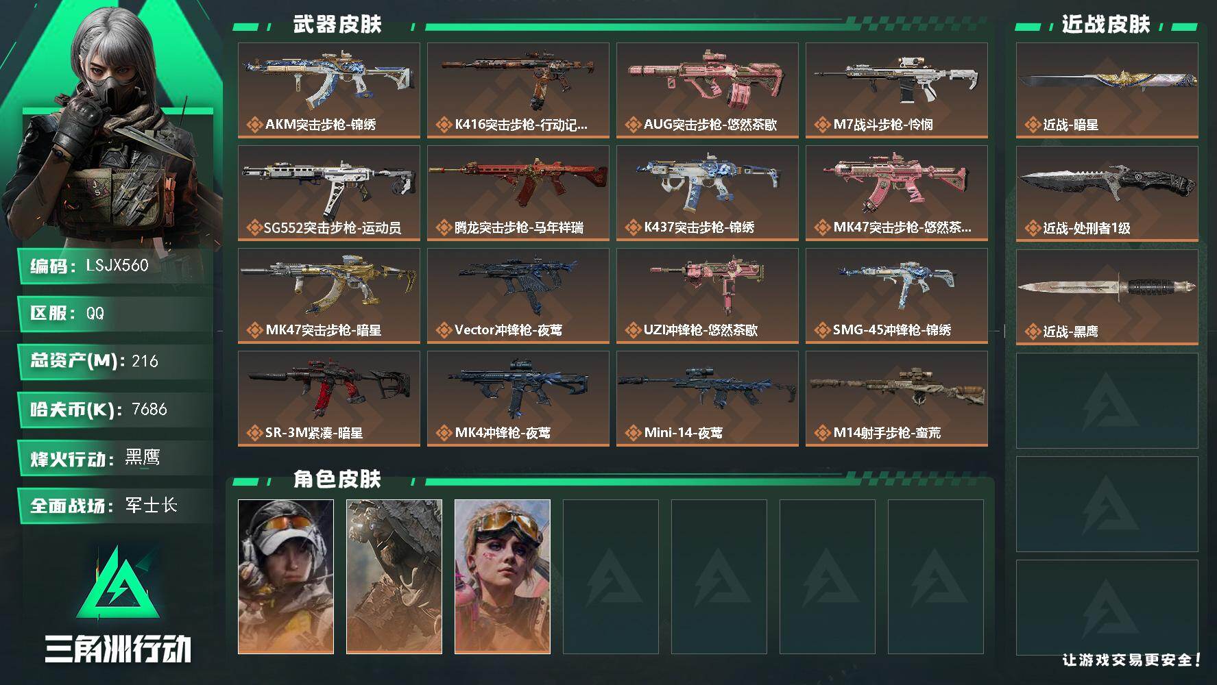 【特价出售/店主推荐】216m总资产-7686k哈夫币-60烽火等级-黑鹰-2