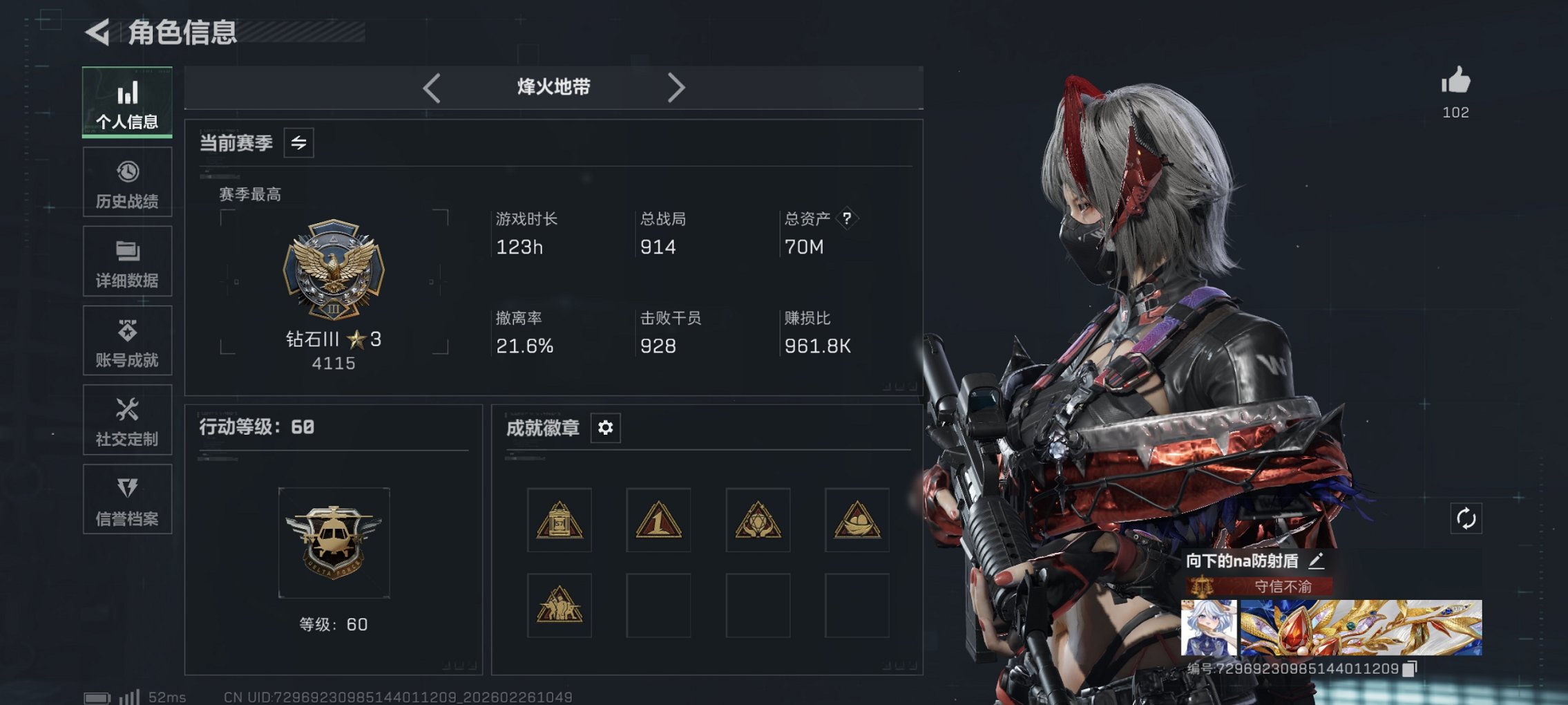 207m总资产-964k哈夫币-60烽火等级-黑鹰-10战场等级-列兵【干员