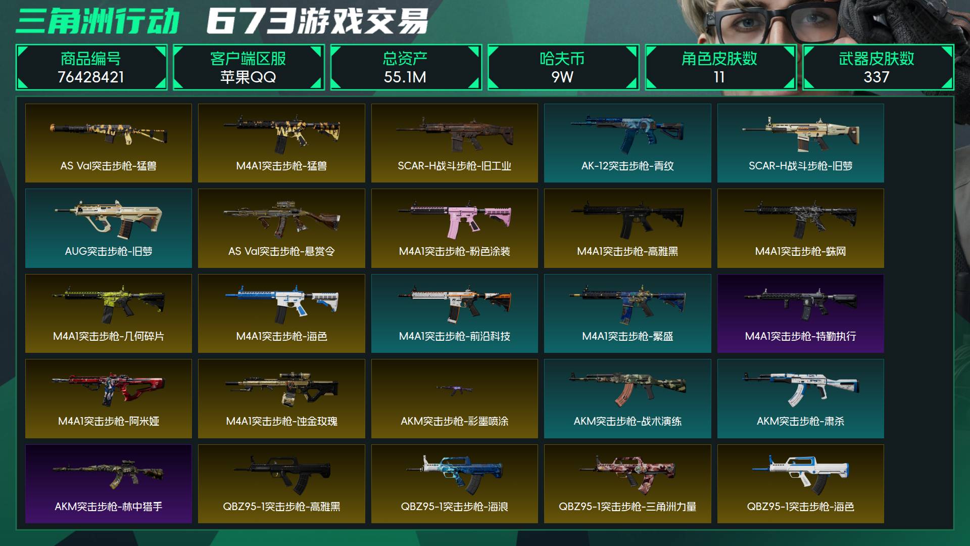 烽火段位黑鹰2 战场段位列兵1 总资产55.1M 哈夫币9W 干员11 挂饰32 近战5 枪械337