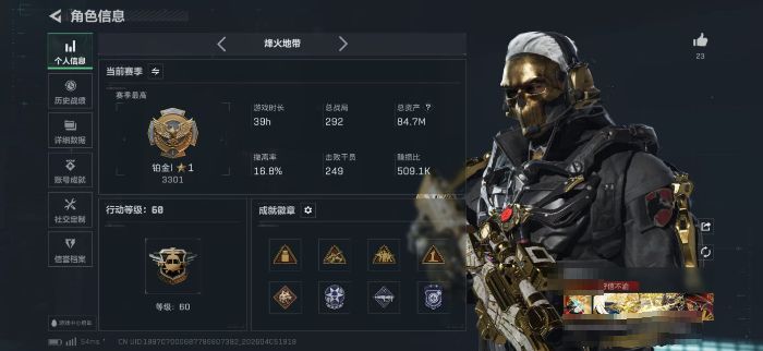 252m总资产-225400k哈夫币-60烽火等级-黄金-16战场等级-上等兵