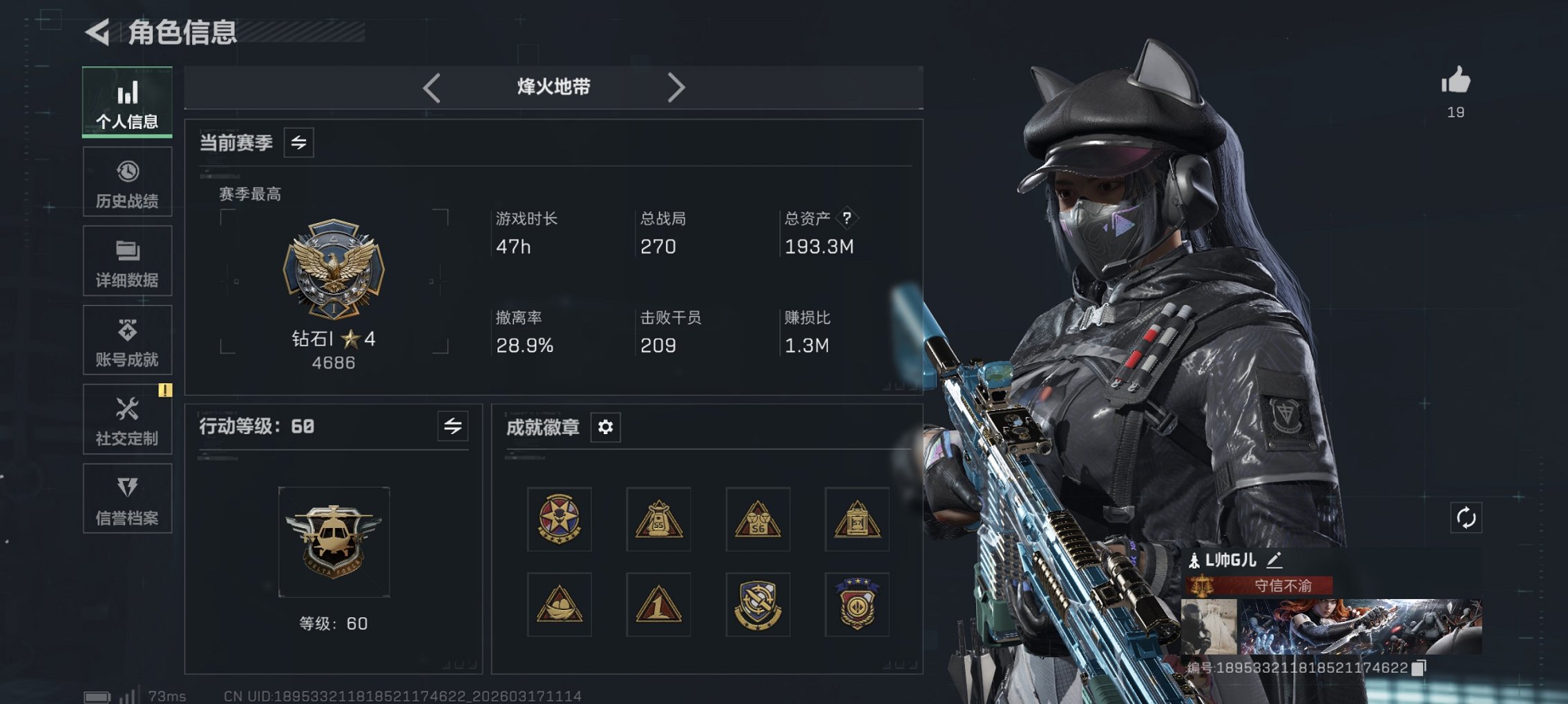总资产(M):189M/哈夫币(K):51018K/传说枪皮数:32/全面战场等级:27_段位:上等兵/烽火地带等级:60_段位:黄金/