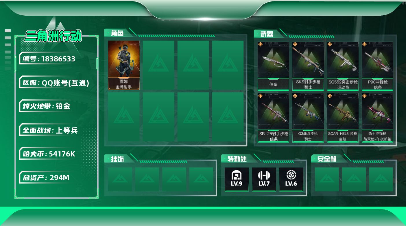 294m总资产-54176k哈伏币-60烽火等级-铂金-32战场等级-上等兵