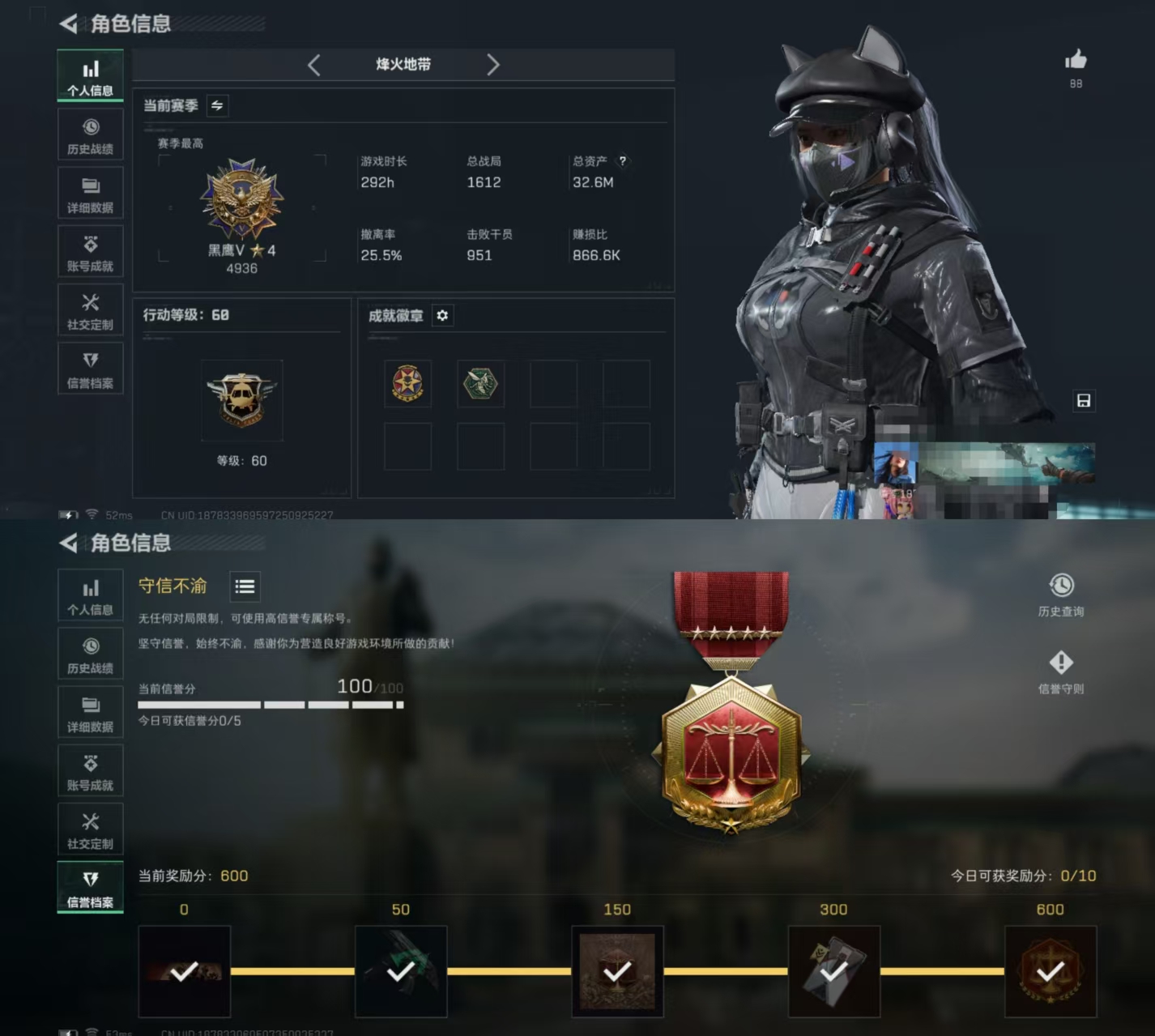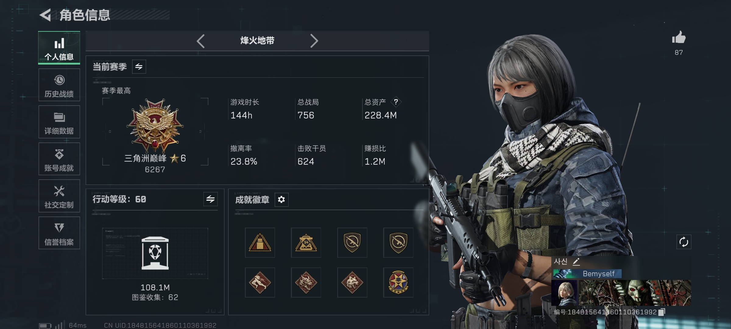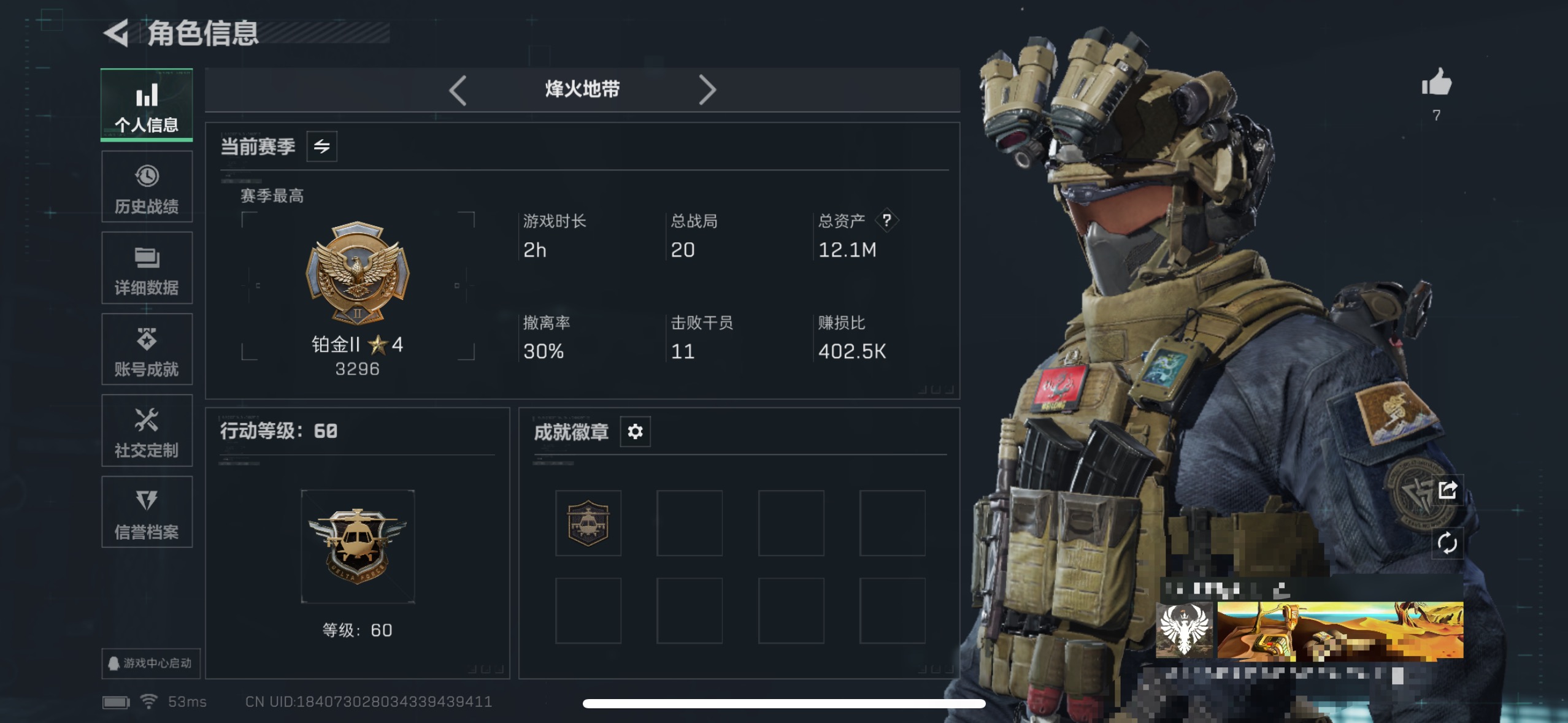 【总资产(M)】12.15【哈夫币】422k【行动等级】60【烽火地带段位】