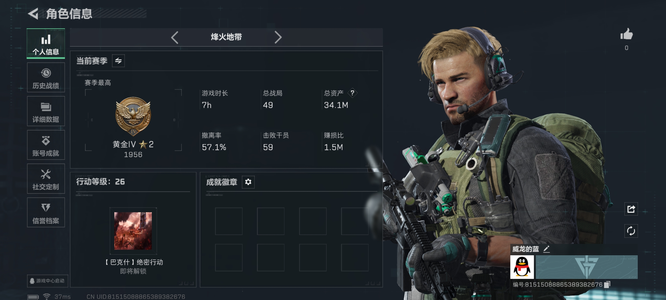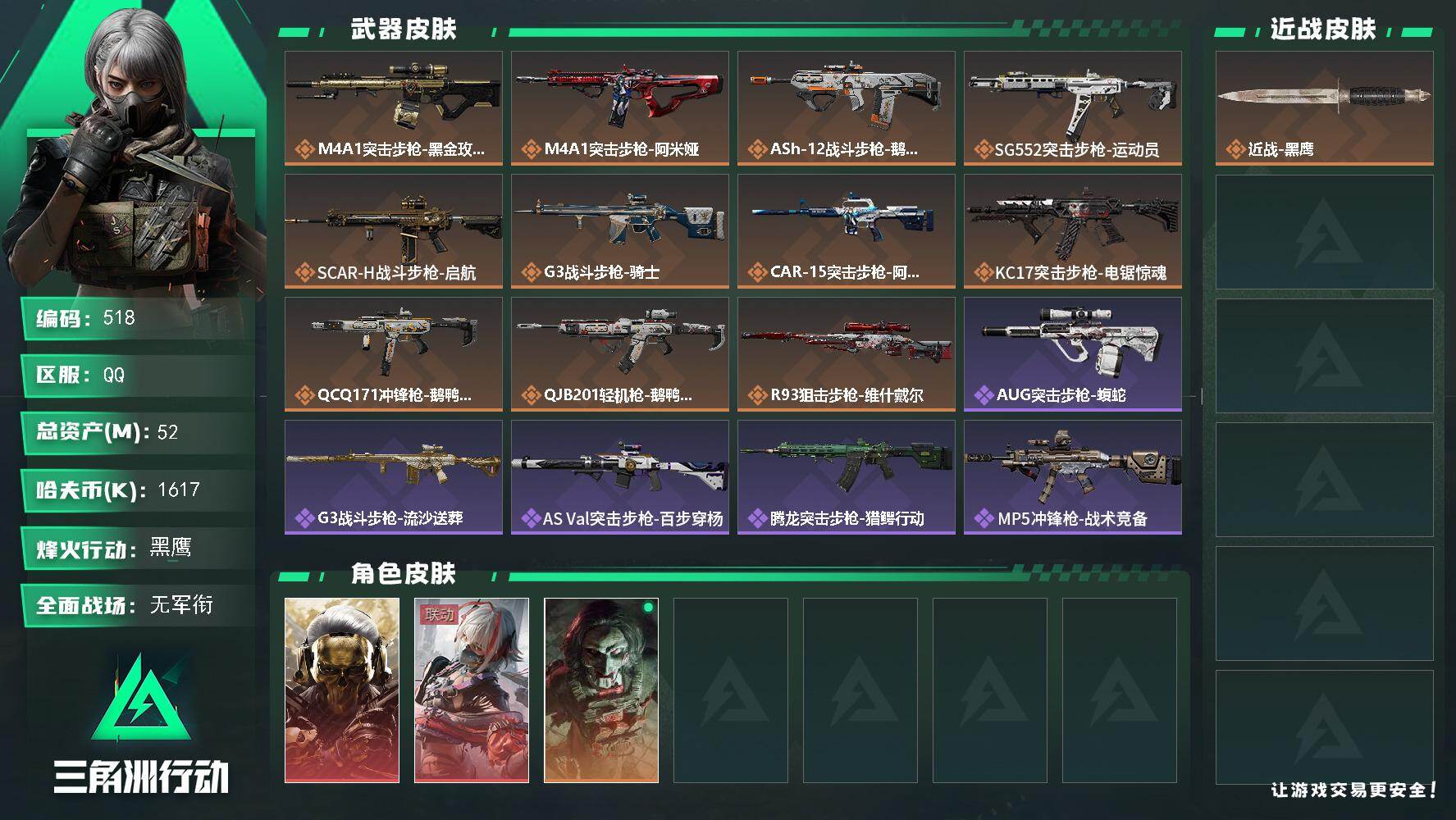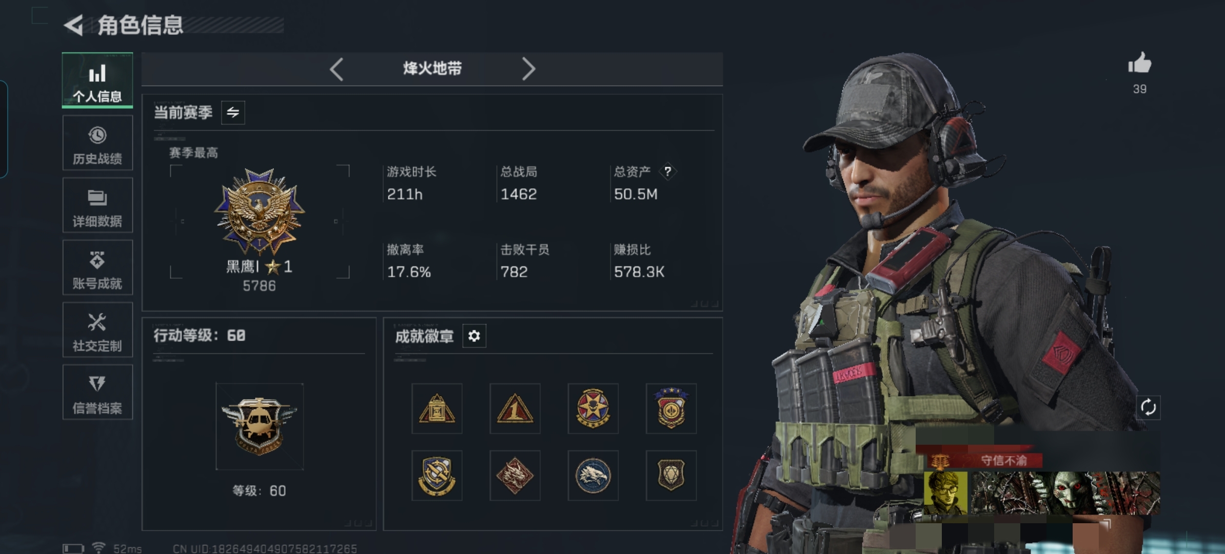 52m总资产-1617k哈伏币-60烽火等级-黑鹰-1战场等级-无军衔【干员