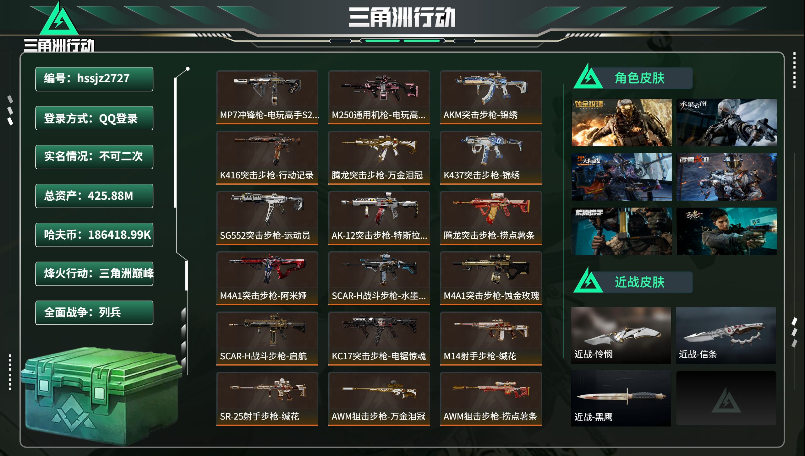 等级:60总资产:280.5M 纯币3890k 红皮:黑天际线 刀皮 北极星 特勤处:仓库9,训练7,靶场6