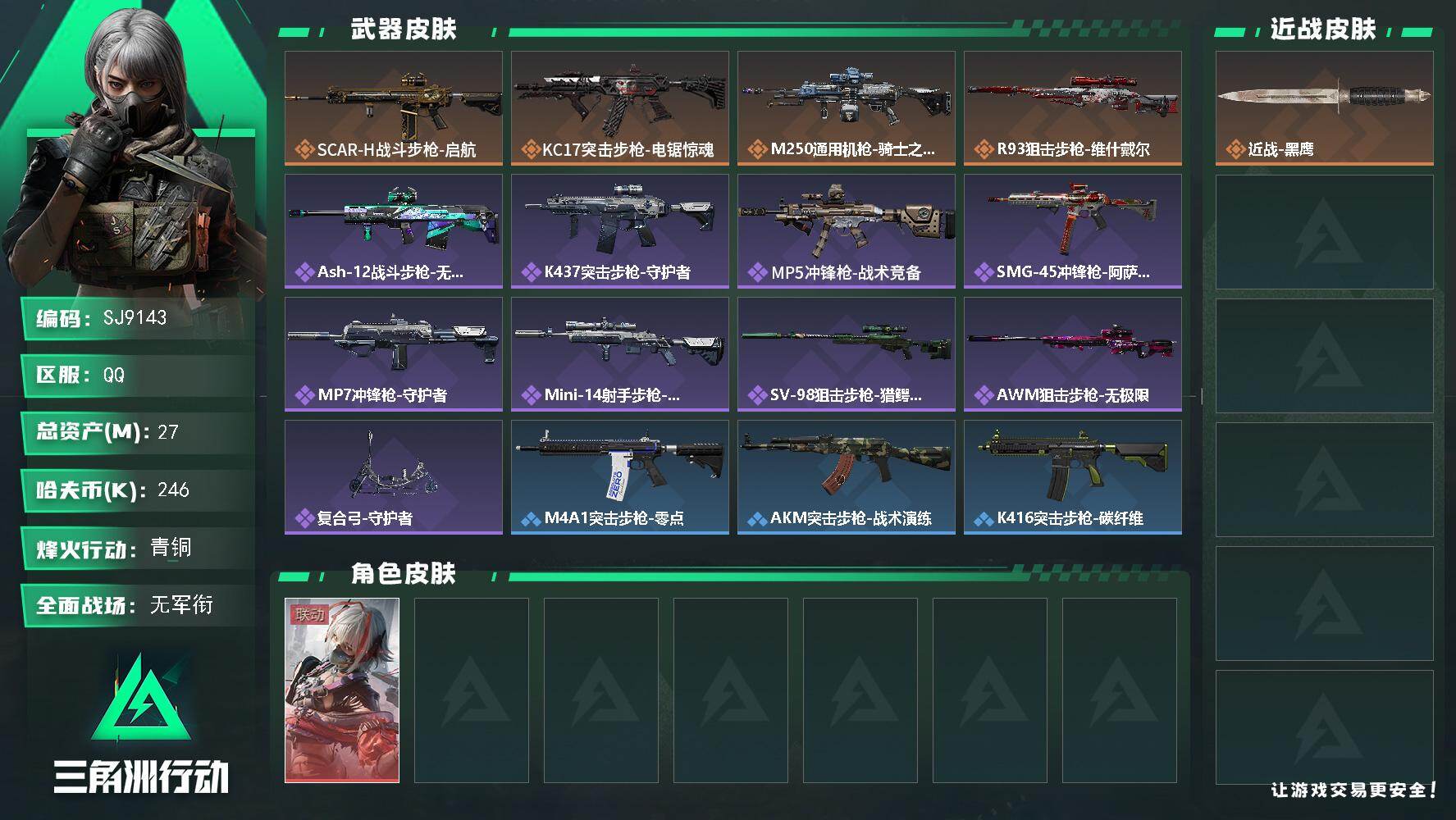 总资产(M):27M/哈夫币(K):246K/传说枪皮数:4/全面战场等级:1_段位:无段位/烽火地带等级:38_段位:青铜/骇爪-维什戴尔/近战-黑鹰/
