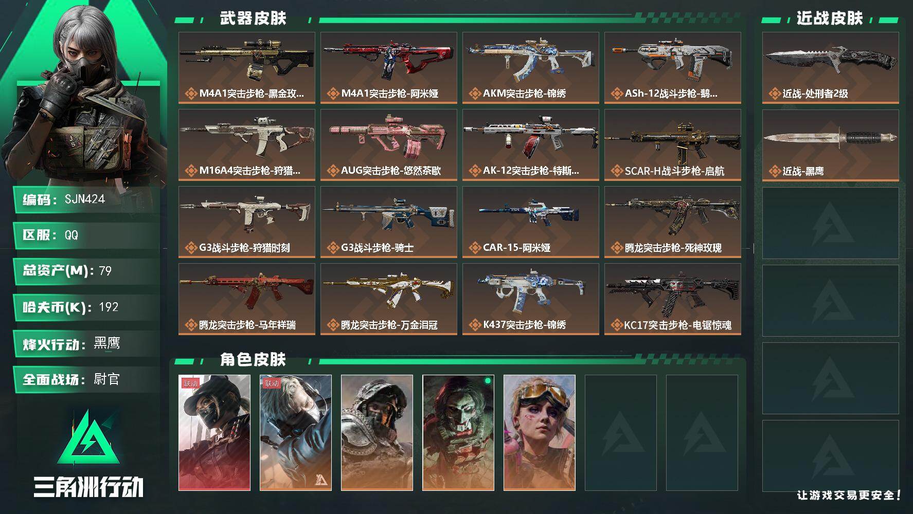 总资产(M):79M/哈夫币(K):192K/传说枪皮数:36/全面战场等级:50_段位:尉官/烽火地带等级:60_段位:黑鹰/露娜-黑·天际线/蜂医-送葬人·无题密令/深蓝-不破誓约/红狼-电锯惊魂/蛊-不羁人生