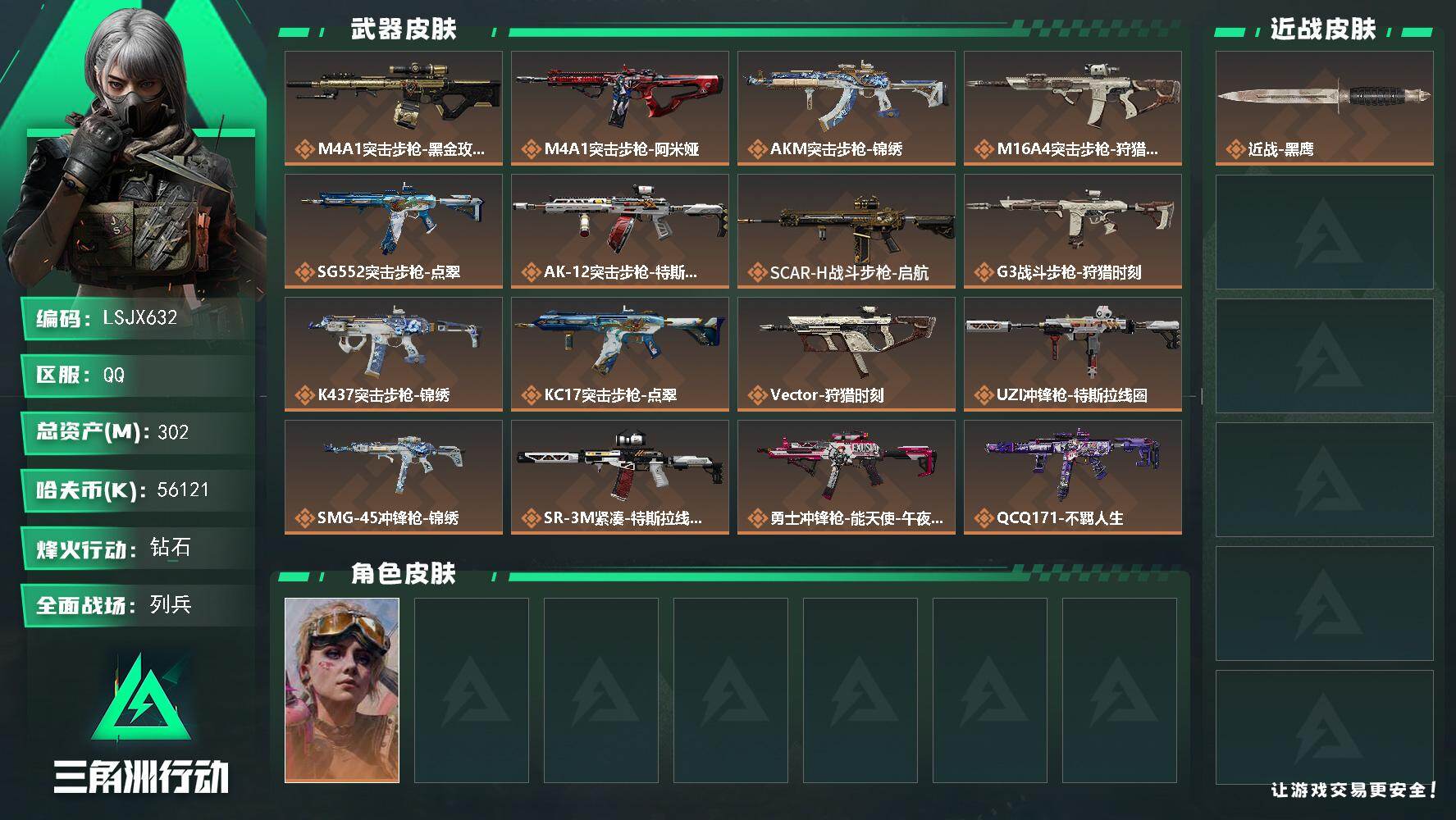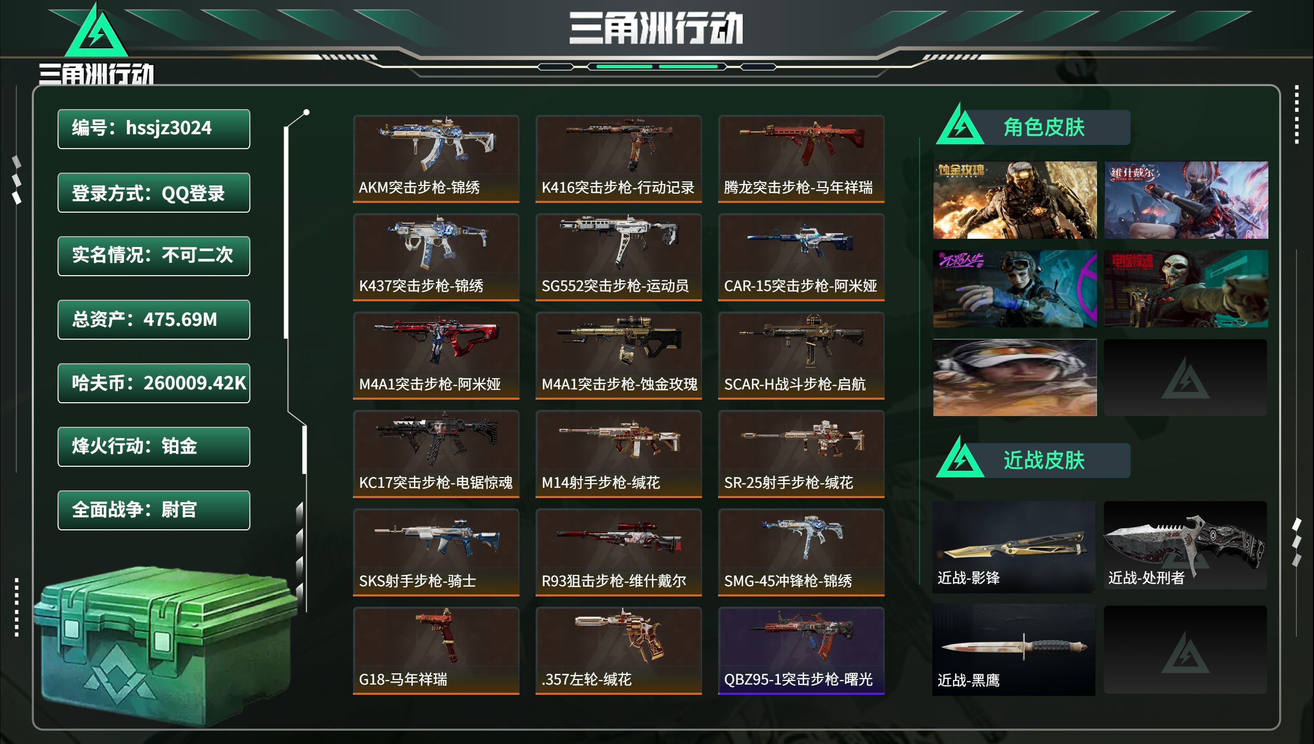415M仓库价值♥流动资产362M♥三人物金皮♥大红小红将近上百个♥收藏室也有几十个红♥绝版枪皮超多
