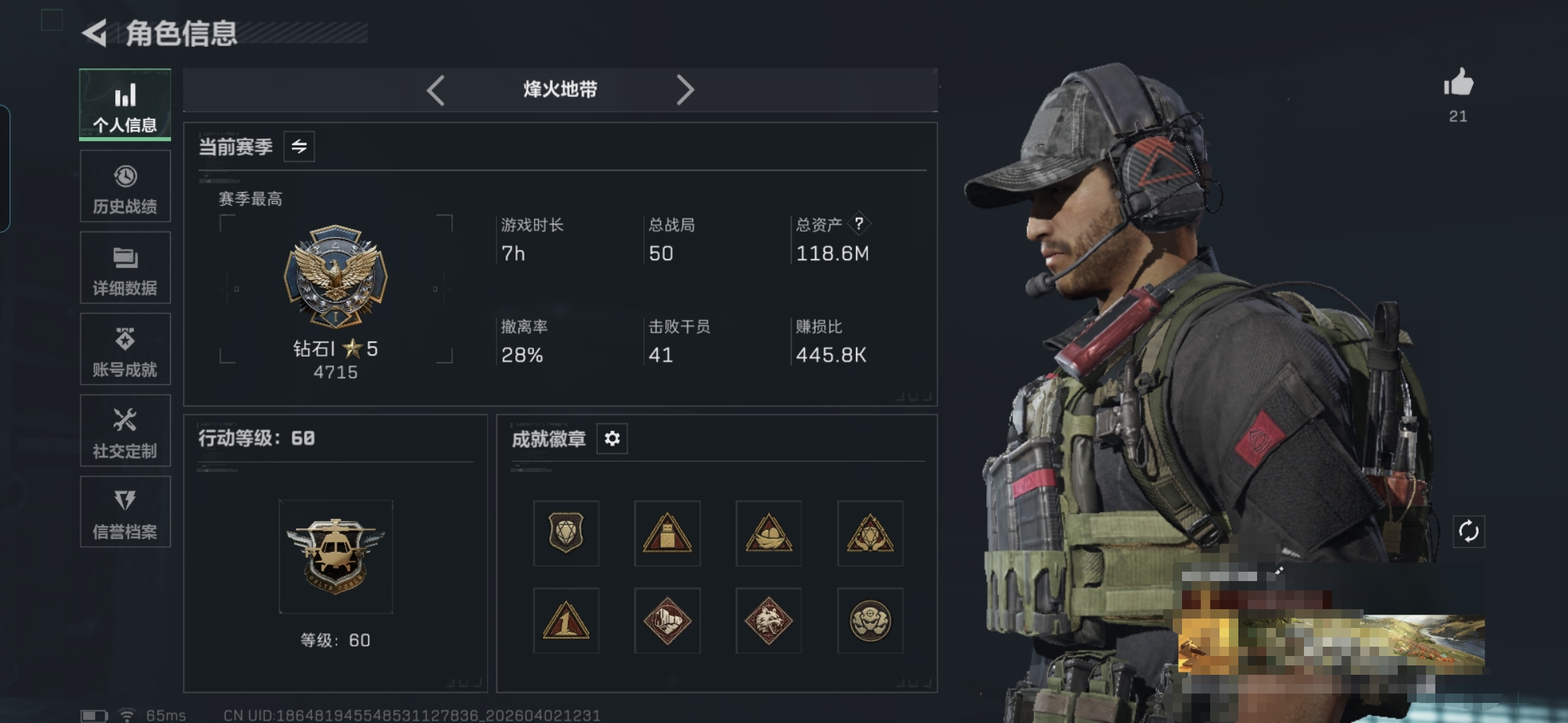 299m总资产-15085k哈夫币-60烽火等级-青铜-50战场等级-校官