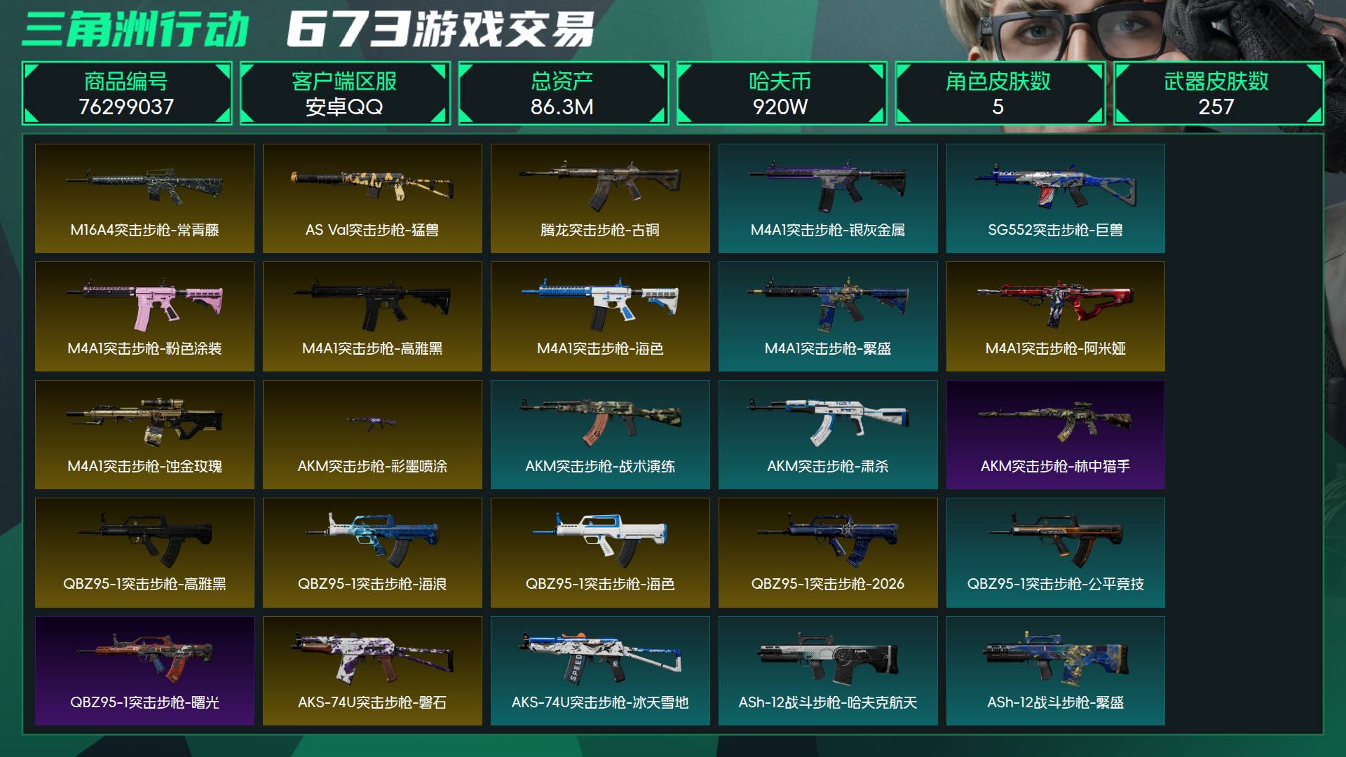 烽火段位黑鹰5 战场段位军士长3 总资产86.3M 哈夫币920W 干员5 挂饰29 近战2 枪械257 载具34
