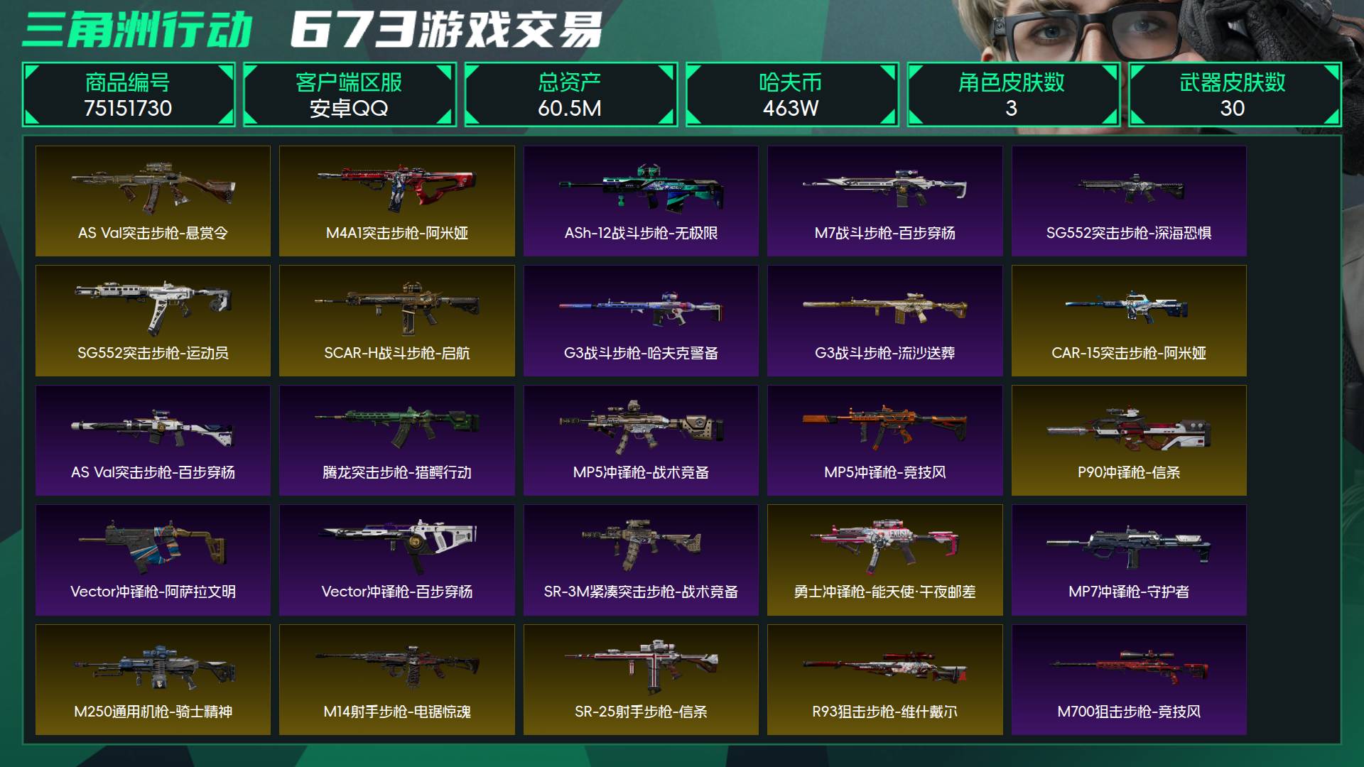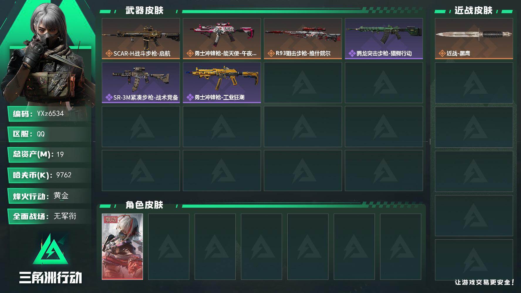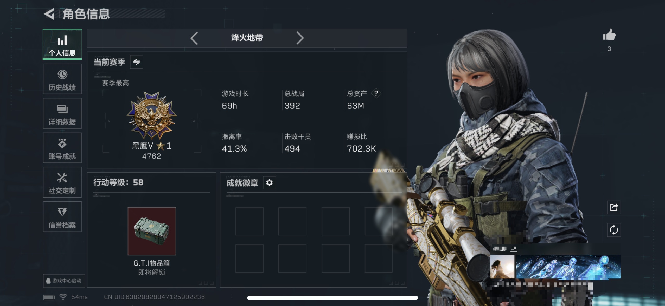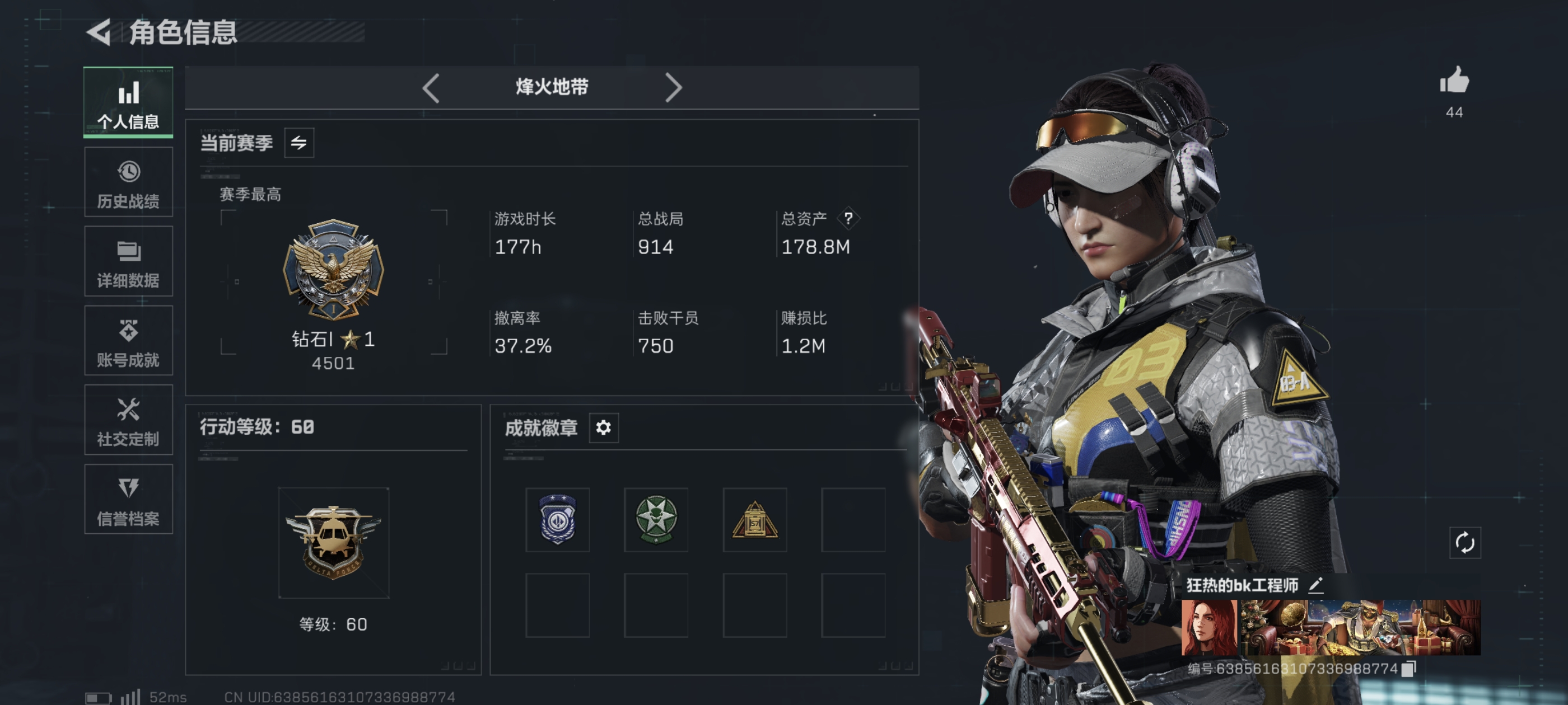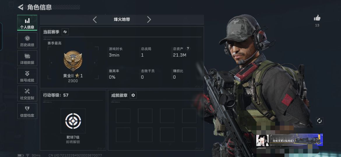 烽火段位钻石3 战场段位上等兵3 总资产60.5M 哈夫币463W 干员3 挂饰6 近战2 枪械30 载具6