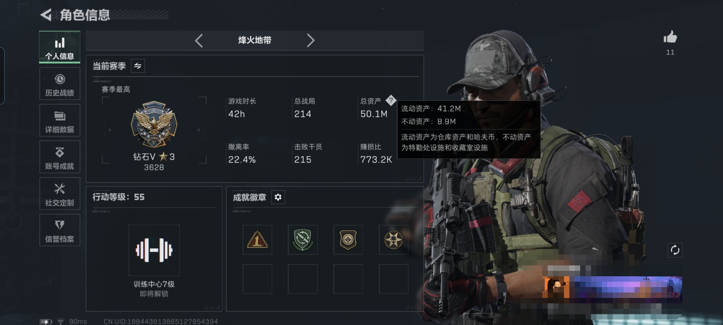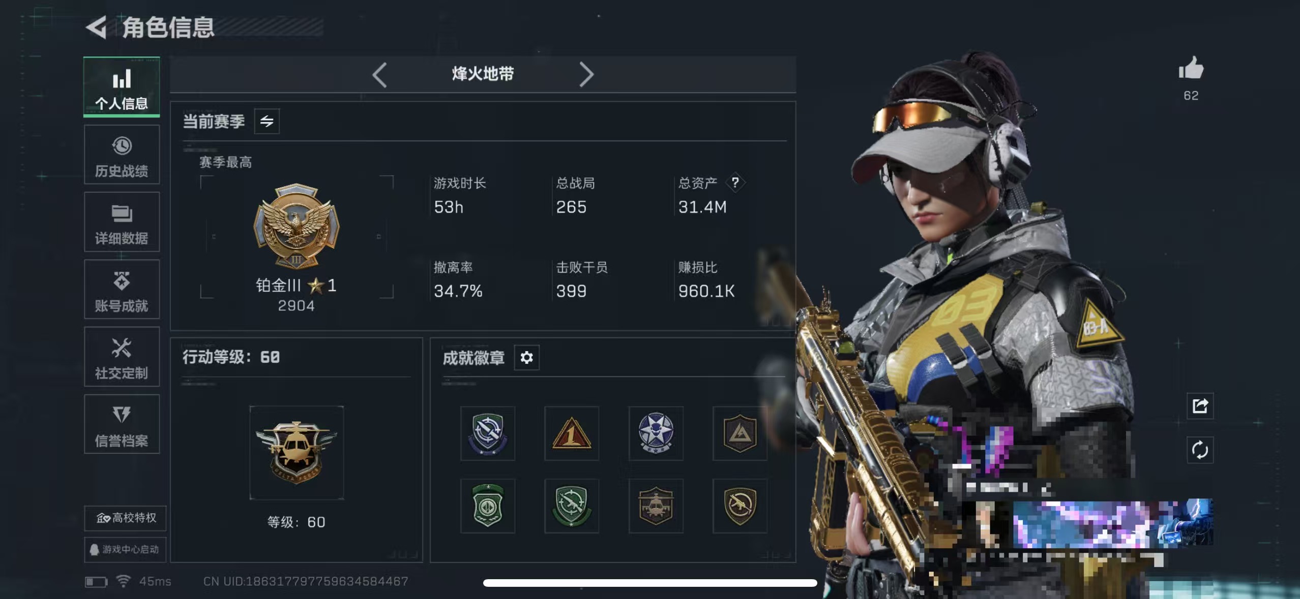 【总资产(M)】50.53【哈夫币】443k【行动等级】60